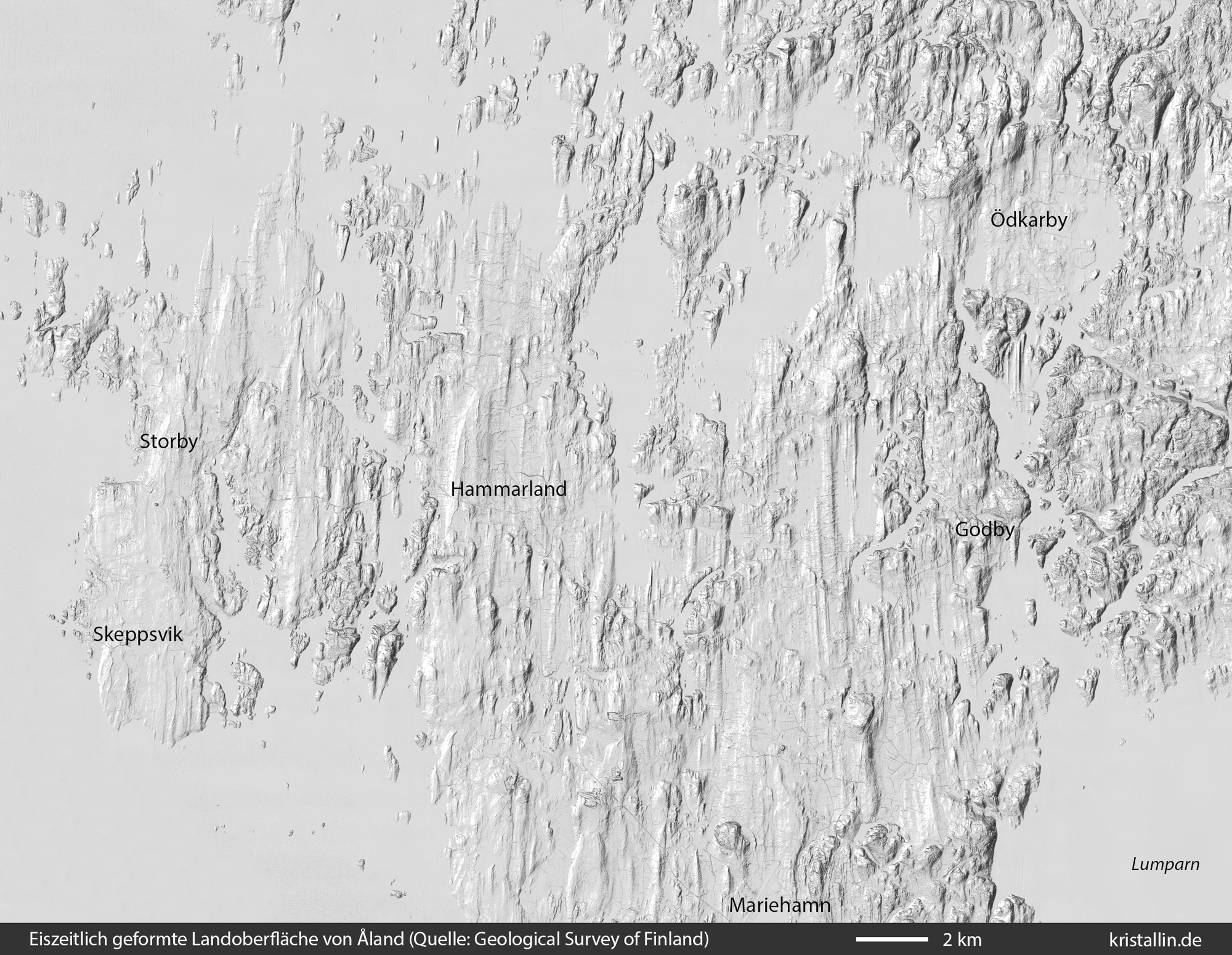 Die Schleifspuren der Gletscher findet man überall auf Åland. Man erkennt sie im Kleinen ebenso wie aus großer Höhe, wie die Reliefkarte der finnischen Geografen zeigt [3]: