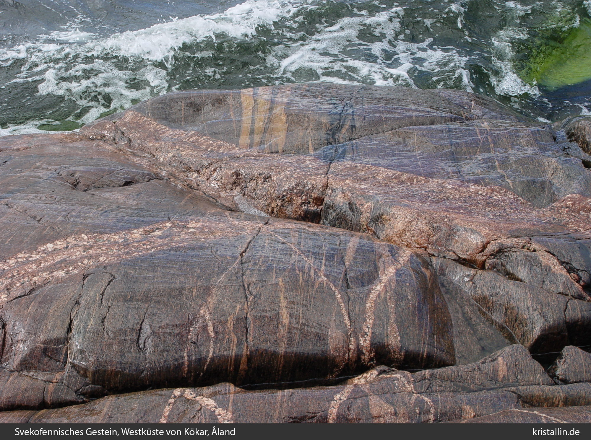 The eastern islands of Åland consist of the old bedrock, which in the terrain is mainly gneiss or migmatite. Both are highly metamorphic rocks and the last traces of the Svekofennian mountain formation about 1.85 billion years ago. They are easily recognizable by their gneissic texture. (Picture 12)