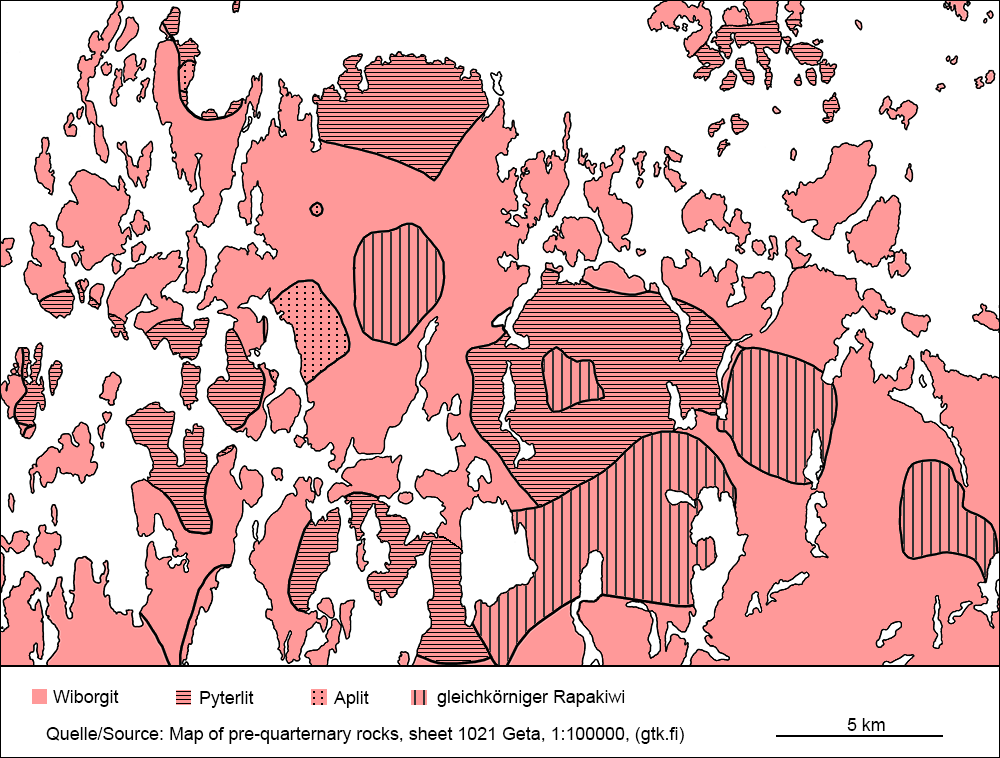 Alle diese verschiedenen Gefüge stammen aus der Zeit vor 1,56 Ga und haben eine ähnliche Zusammensetzung. Sie bestehen aus viel Alkalifeldspat, viel Quarz und etwas Plagioklas. Rein von ihrer Zusammensetzung her sind sie alle Granite, haben jedoch zum Teil recht ungewöhnliche Gefüge. Besonders auffällig sind natürlich die runden Feldspäte in einigen der grobkörnigen Granite. Man nennt sie in Finnland traditionell „Rapakivi“ (Rapakiwi). Die Entstehung dieser Granite war lange Zeit Gegenstand von Spekulationen, denn Feldspäte wachsen normalerweise nicht als runde Kristalle. Seit dem Ende des 20. Jahrhunderts weiß man, dass sie das Ergebnis eines besonderen Abkühlungsverlaufs und eines Magmas mit ungewöhnlichen Eigenschaften sind. (Siehe auch: Was sind Rapakiwis?)