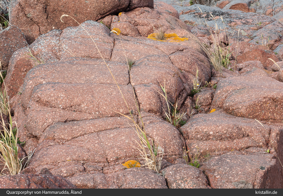 (7/100) Anstehender Hammarudda-Quarzporphyr. Ein so lebhaft gezeichneter und grobkörniger Quarzporphyr ist auch in Skandinavien selten. (Bildbreite in der Mitte etwa 2 Meter.)