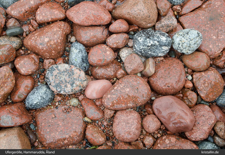 (10/100) Ufergerölle am Strand von Hammarudda. Ihre Herkunft kann man recht einfach an der Gesteinsart erkennen. Alle magmatischen Gesteine mit rotbrauner Farbe gehören zum Ålandpluton, während die schwarzweißen Steine svekofennische Geschiebe sind. Der ganz oben rechts könnte eventuell ein Revsund-Granit aus Nordschweden sein. Links unterhalb der Bildmitte, gestreift und fast rosa, ein Sandstein aus der Bottensee.