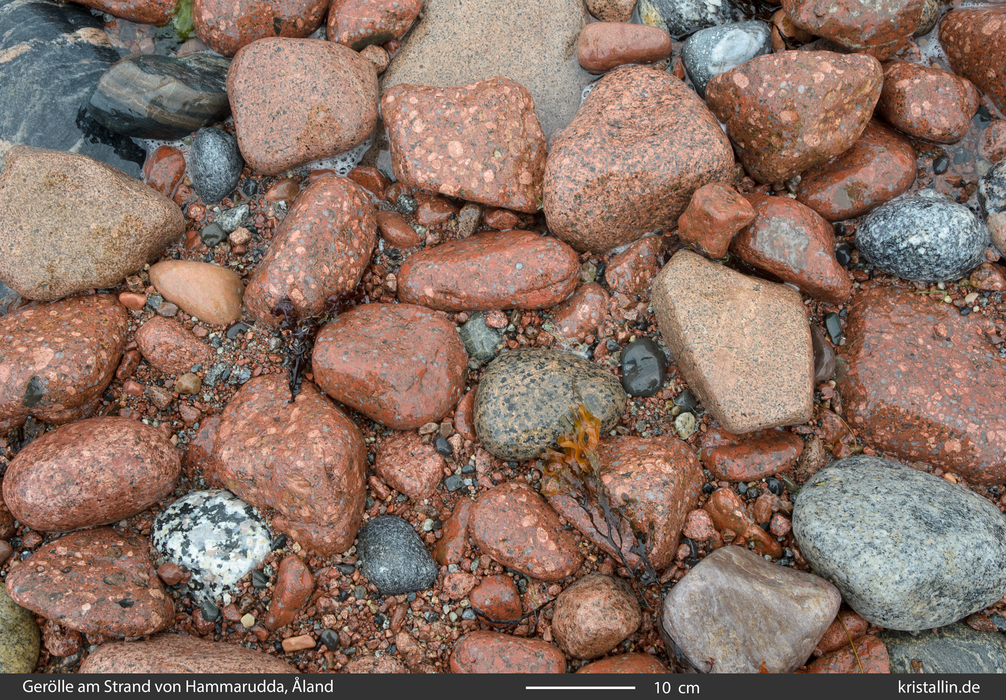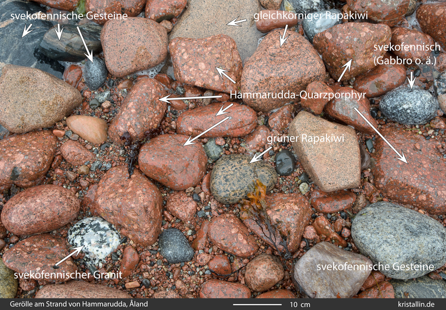 (12/100) Gleicher Strand, andere Stücke. Zwischen den Quarzporphyren liegt hier auch ein grüner Rapakiwi. Findet man die als Geschiebe, kommen sie garantiert von Åland. (Bild ohne Beschriftung)