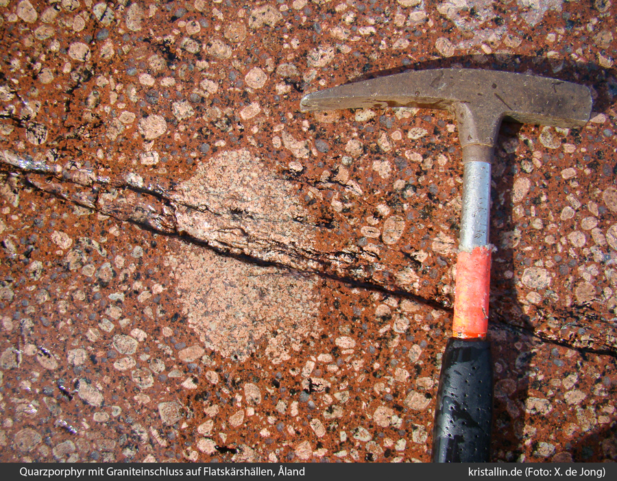 (25/100) Dieser eingeschlossene gleichkörnige Granit gehört vermutlich zum Ålandpluton - einfach, weil es kaum andere gleichkörnige Granite in der Nähe gibt. Auch er befand sich gerade in Aufschmelzung, was man am sich auflösenden Rand sehen kann.