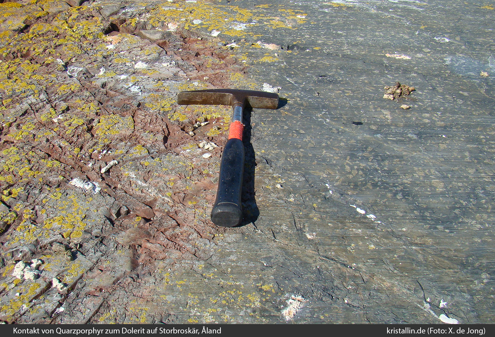 (32/100) Links der Quarzporphyr, rechts der Dolerit mit Gletscherstriemen. Das Eis kam von rechts. Der Dolerit steckt voller Feldspäte, die natürlich alles Plagioklase sind. Ein Dolerit (Diabas) ist, chemisch gesehen, das gleiche wie ein Gabbro oder ein Basalt. Sie alle bestehen aus Plagioklas und Pyroxen und gelegentlich auch etwas Magnetit.