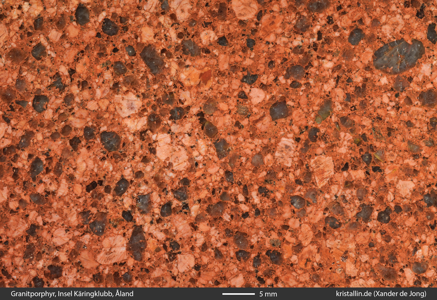 (43/100) Auch so etwas gibt es auf Käringklubb: Ein Granitporphyr, der fast schon ein Granit ist. Die großen korrodierten Quarze zeigen, dass das Gestein zur Rapakiwifamilie gehört.