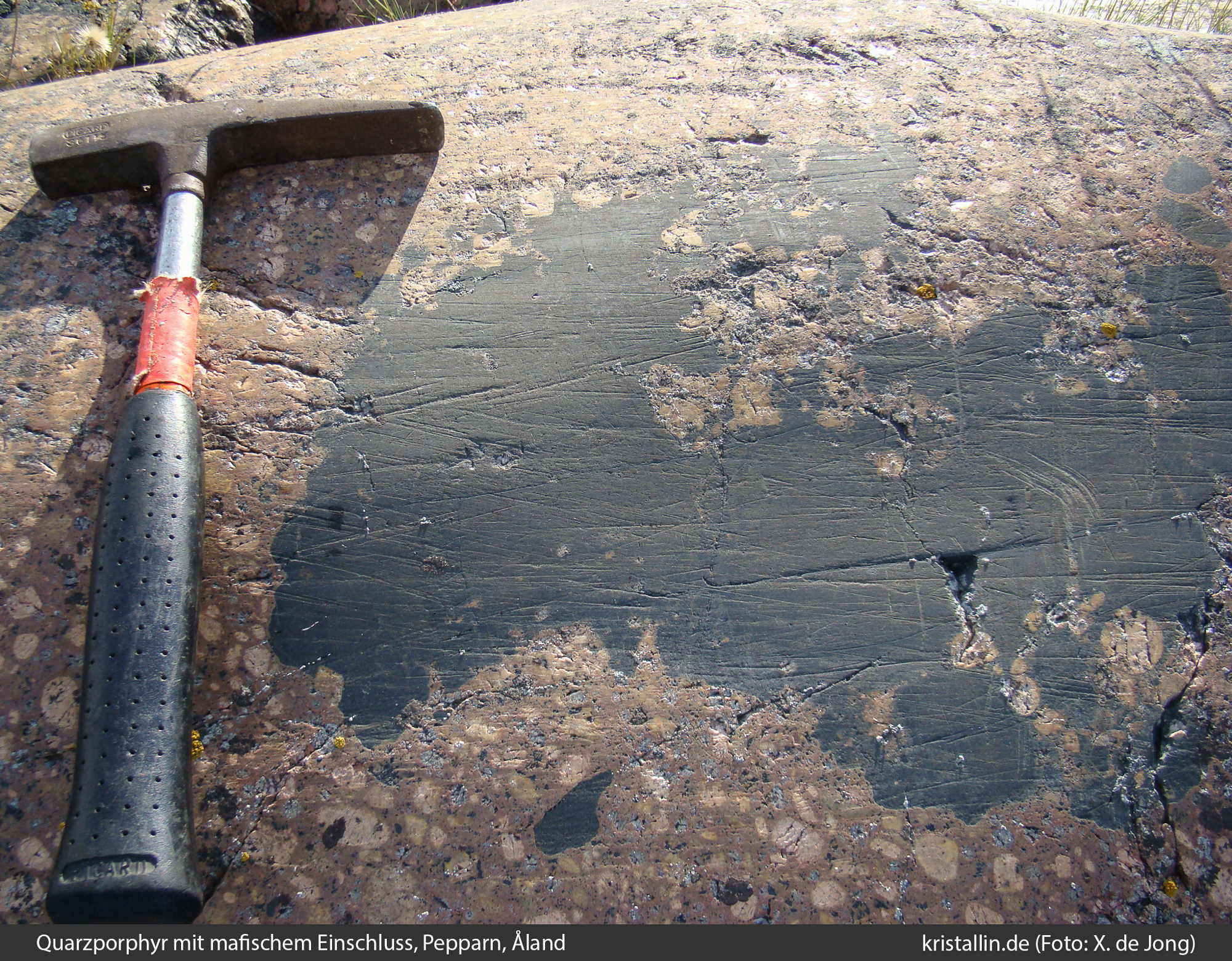 (54/100) Ein vertrautes Bild: grobkörniger Quarzporphyr vom Hammaruddatyp mit weitgehend aufgelösten dunklen Einschlüssen. Die Kratzer sind Gletscherstriemen aus der letzten Eiszeit.