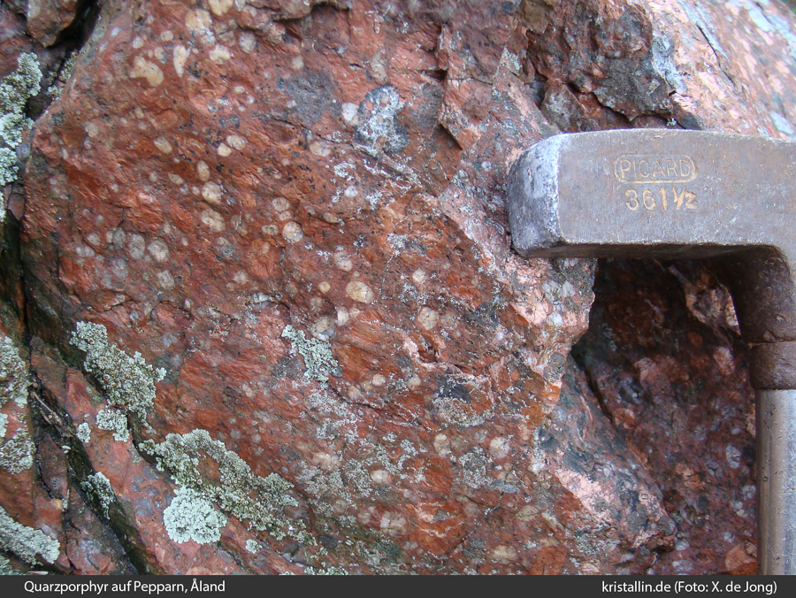 (65/100) Auch das ist ein Porphyr auf Pepparn. Die Feldspäte sind rot und blass gelblich, alle recht klein und durchgehend gerundet. Nur ganz unten links gibt es ein paar einzelne Quarze. Das reicht aber nicht, um das Ganze einen Quarzporphyr zu nennen. Solche und andere Porphyre findet man immer wieder mal. Für die Geschiebekunde sind solche Kleinstvorkommen ohne Bedeutung.