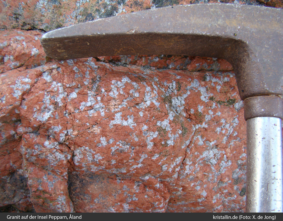 (66/100) Ein Granit, der zur Rapakiwifamilie gehören könnte (aber nicht muss). Solche Gefüge aus rotem Kalifeldspat und körnigen weißen Quarzen findet man ab und zu auf Åland, aber auch in Ostschweden. So hübsch diese rot-weißen Granite auch aussehen, sind sie als Geschiebe keinem Vorkommen zuzuordnen.