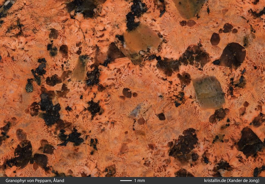 (70/100) Die Grundmasse besteht komplett aus graphischen Verwachsungen. In der Vergrößerung erkennt man die teils schriftgranitischen, teils blumenähnlichen Quarze, die mit dem rötlichen Alkalifeldspat verwachsen sind. Ein Gestein, das wie dieses hier fast völlig aus graphischen Verwachsungen besteht, wird „Granophyr“ genannt. (Genau genommen müsste es „Graphophyr“ heißen.) Sieht unter der Lupe toll aus, kommt aber auch in anderen Rapakiwiplutonen vor und ist deshalb kein Leitgeschiebe.