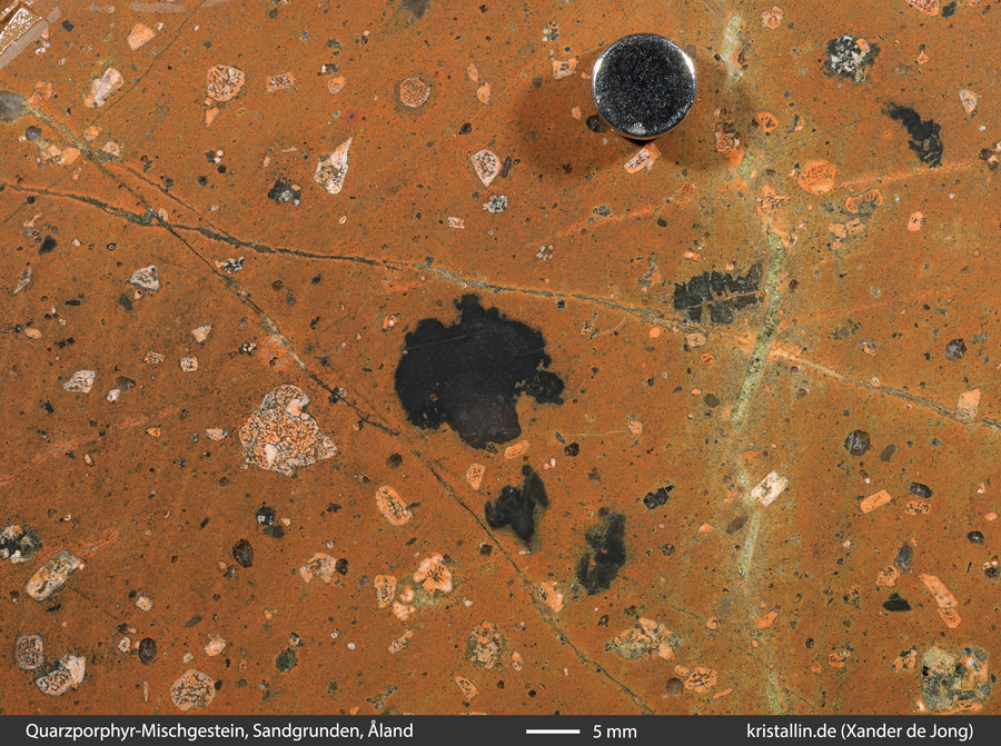 (95/100) Gleicher Gang, anderes Handstück. Das ist der Klassiker: Helle Schmelze, die dunkles Material aufnimmt und zum Teil verdaut - erkennbar wieder an den ausgefransten Umrissen der schwarzen Xenolithe. Der Magnet oben zeigt, dass es hier außerdem auch Magnetit gibt. Alles passt zusammen.