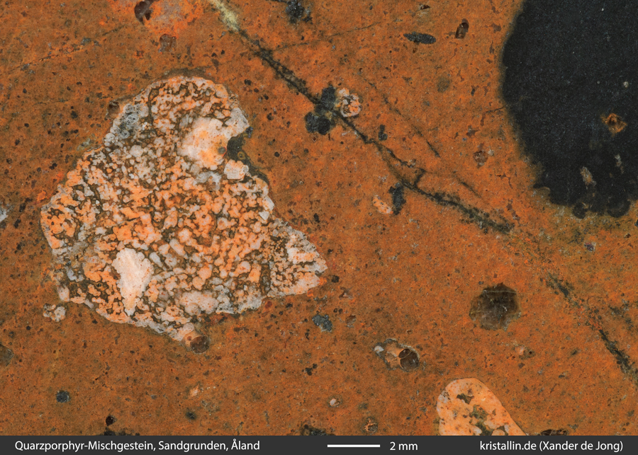 (96/100) Dieser Einsprengling (links) scheint eher ein Gesteinsfragment zu sein, denn der Rest eines Kristalls. Rechts unterhalb der Mitte zwei unscheinbare graue Quarze.