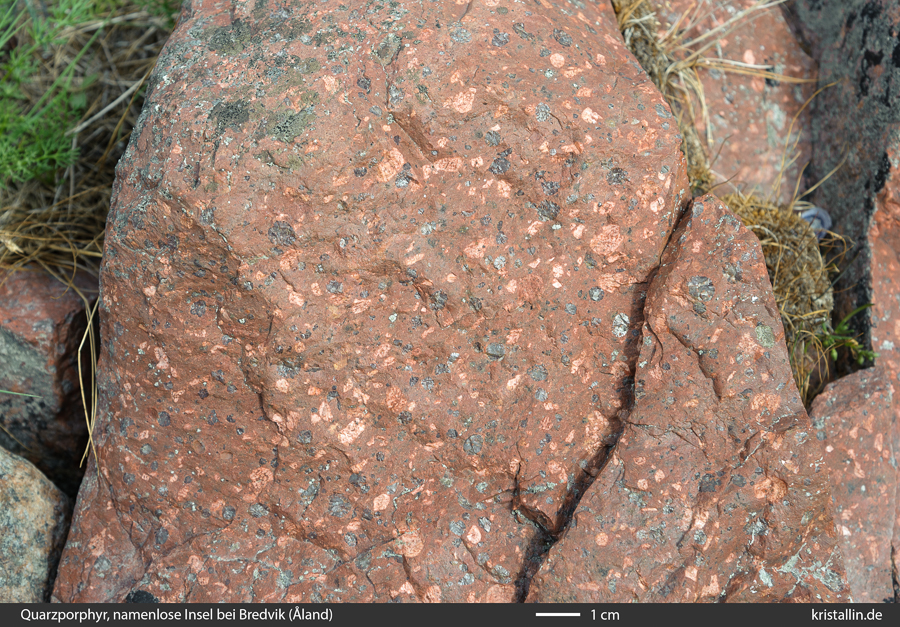 (7/99) Etwas näher dran. Man kann die hellen Feldspäte, die grauen Quarze und die Grundmasse erkennen.