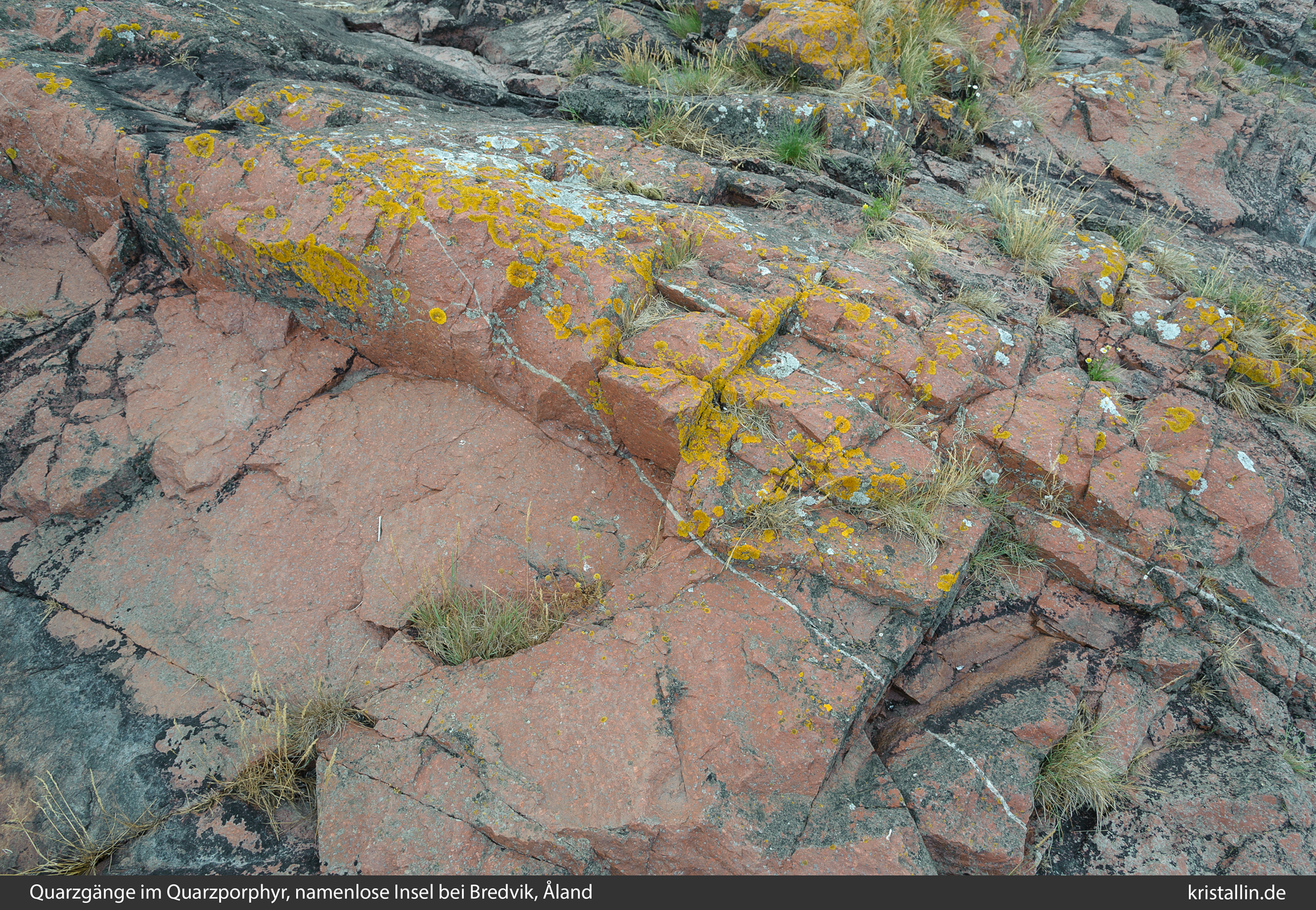 (11/99) Durch den Quarzporphyr ziehen sich dünne weiße Quarzgänge, die trotz ihrer Länge immer gleich schmal bleiben.