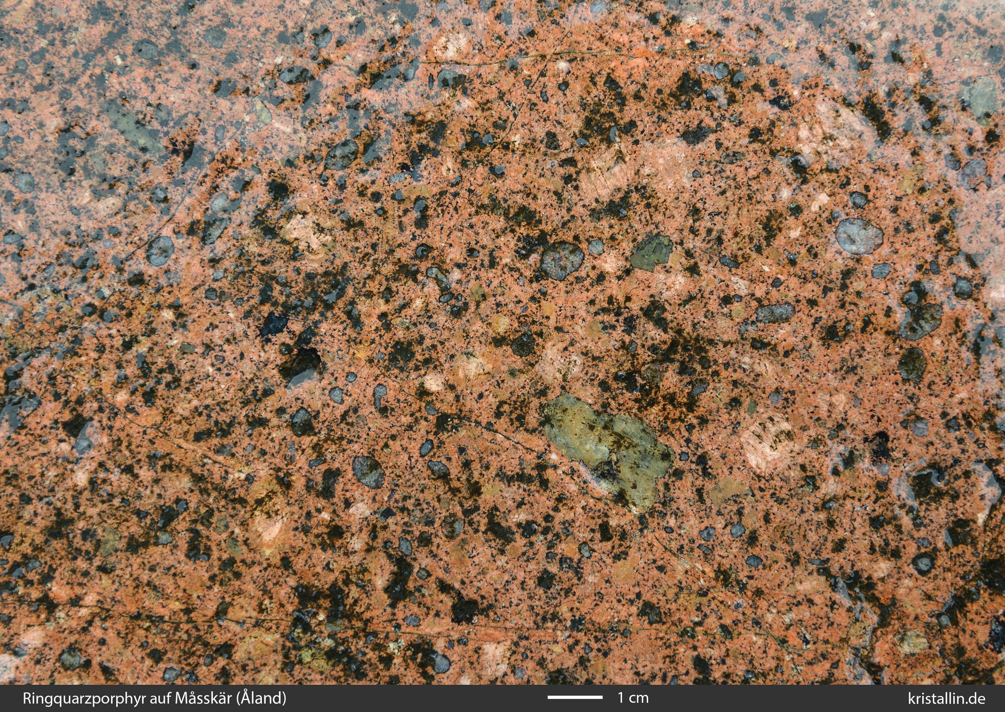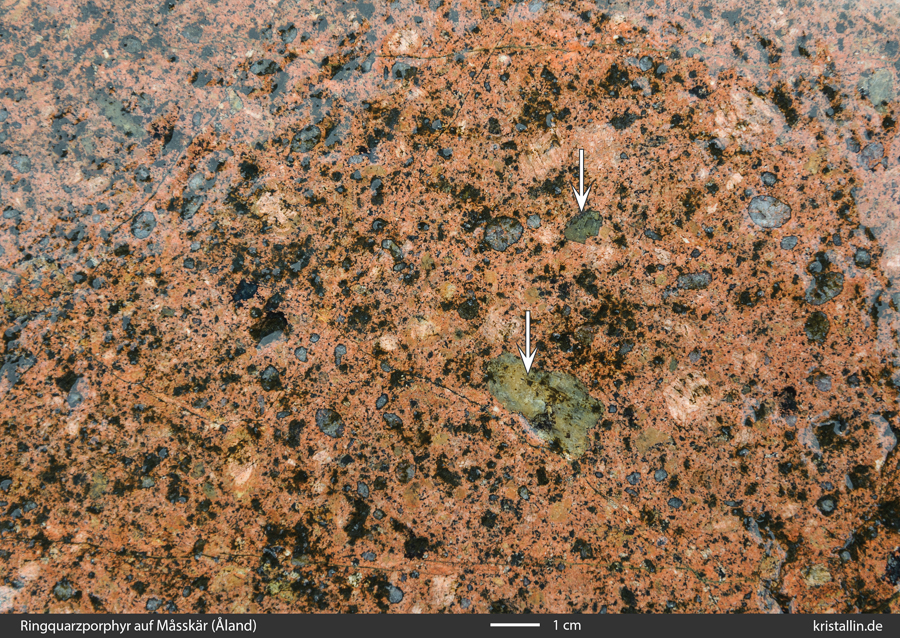(45/99) Die Insel besteht, soweit wir das untersucht haben, komplett aus Ringquarzporphyr. Also der für Åland typische Granitporphyr mit den schwarz gesäumten großen Quarzen. Die Pfeile zeigen auf Plagioklaseinschlüsse, die man oft in diesem Gestein findet. (Beschreibung hier, das Bild ohne Beschriftung hier.)