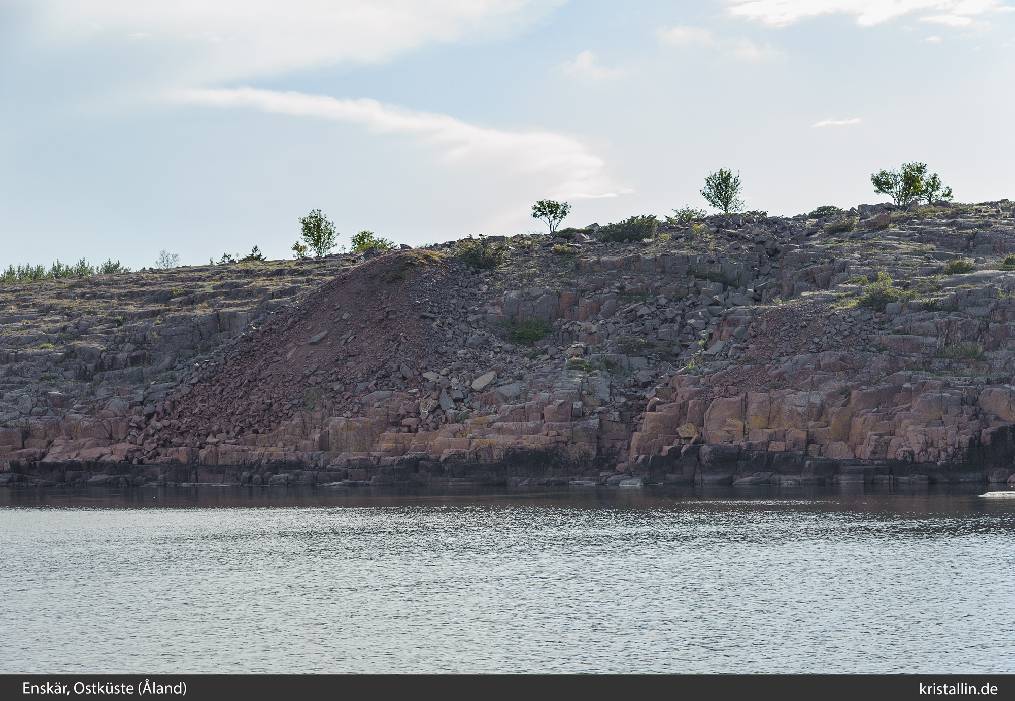 (47/99) Weiter südlich fahren wir an der Küste von Enskär entlang. Der Schutt auf der Uferböschung stammt aus dem letzten Weltkrieg, als man auf Enskär eine ganze Reihe von Bunkern in den Fels sprengte. Auch ein komplettes Krankenhaus soll noch vorhanden sein, sagte unser Bootsführer. Allerdings wurden alle Zugänge gesprengt.