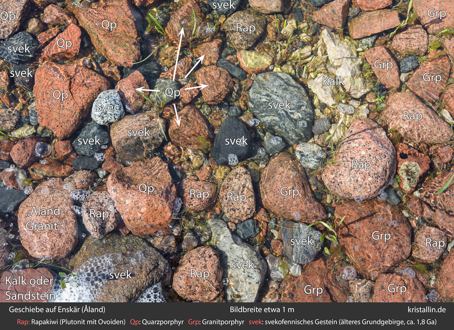 (53/99) Ein Blick ins flache Wasser. Vieles hier gehört zwar zum Ålandpluton, stammt aber aus dem unter Wasser liegenden Gebiet nördlich von hier. Da sich die Gletscher hier genau nach Süden bewegten, haben wir nur diese Geschiebe, um etwas über den Westen des Ålandplutons zu erfahren. Weiter südlich ist nur noch Ostsee. Deshalb sind wir so scharf auf die Nahgeschiebe. (Bild ohne Beschriftung)