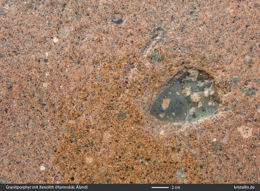 (59/99) Wieder einer der vielen mafischen Xenolithe mit Feldspäten darin. Einzelheiten zu dieser Magmenmischung im Text zu den Granitporphyren.