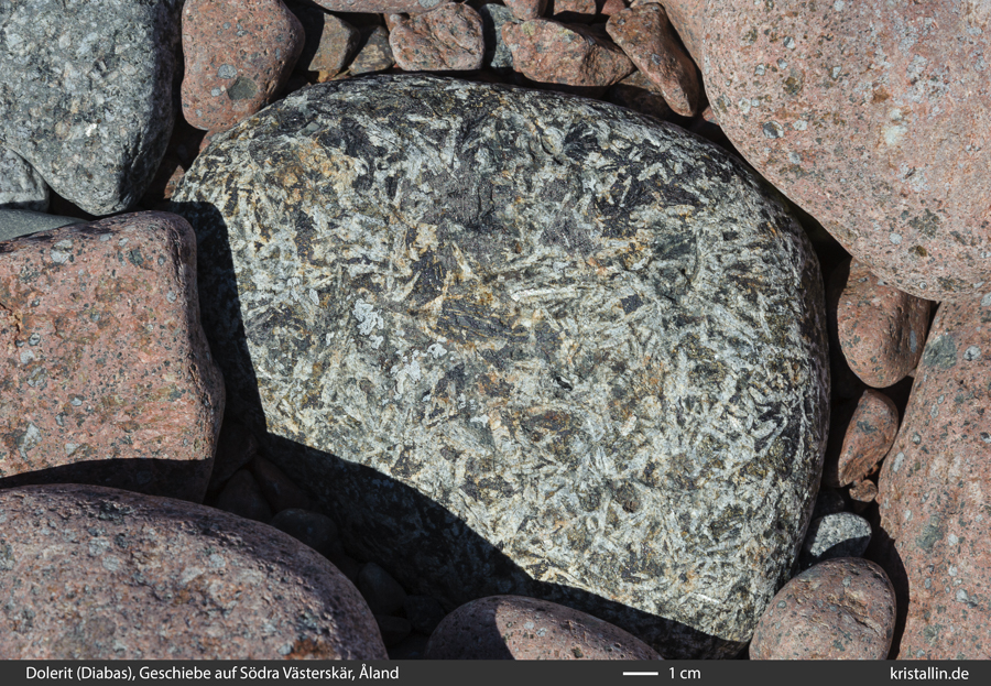 (72/99) Und noch einer, der nun richtig grobkörnig ist. Wie alle Dolerite besteht auch der aus Plagioklas, Pyroxen und oft auch Magnetit.