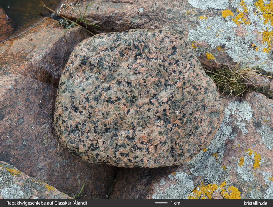 (89/99) Ein Rapakiwi mit rötlich-grüngrauer Färbung. Auch der kommt von irgendwo nördlich. Naheliegend ist der Ålandpluton, aber es wäre auch der nördliche Teil des Nordingrå-Rapakiwis denkbar, der in die Bottensee reicht. Die Färbung erinnert mich an Nordingrå, aber da lege ich mich nicht fest.