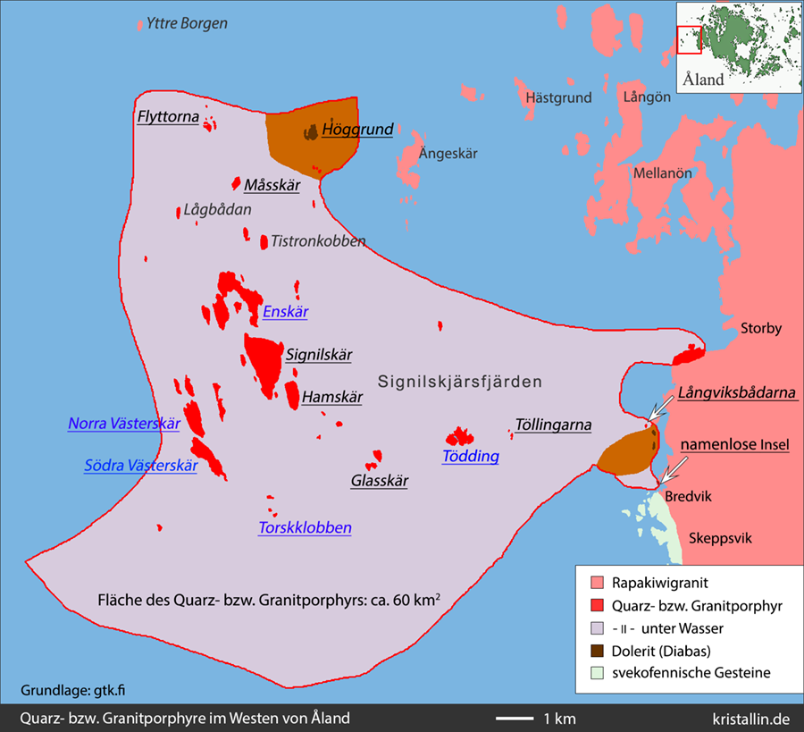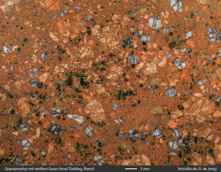 (1/26) Schnitt durch einen der braunen Quarzporphyre von der Insel Tödding, westlich von Åland. (Karte) Die weißen Quarze sind nicht zu übersehen.