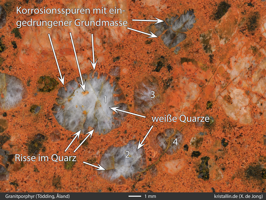 (9/26) Ebenfalls Tödding, jetzt aber ein Granitporphyr. Die Weißfärbung sollte für die hier beschriebenen Porphyre mindestens bei einigen Quarzen kräftig wie hier bei Nummer 1 und 2 sein. Eine nur schwache Färbung wie bei den Quarzen 3 und 4 findet man auch in anderen Gesteinen. Das genügt also noch nicht für einen „Porphyr mit weißen Quarzen“.