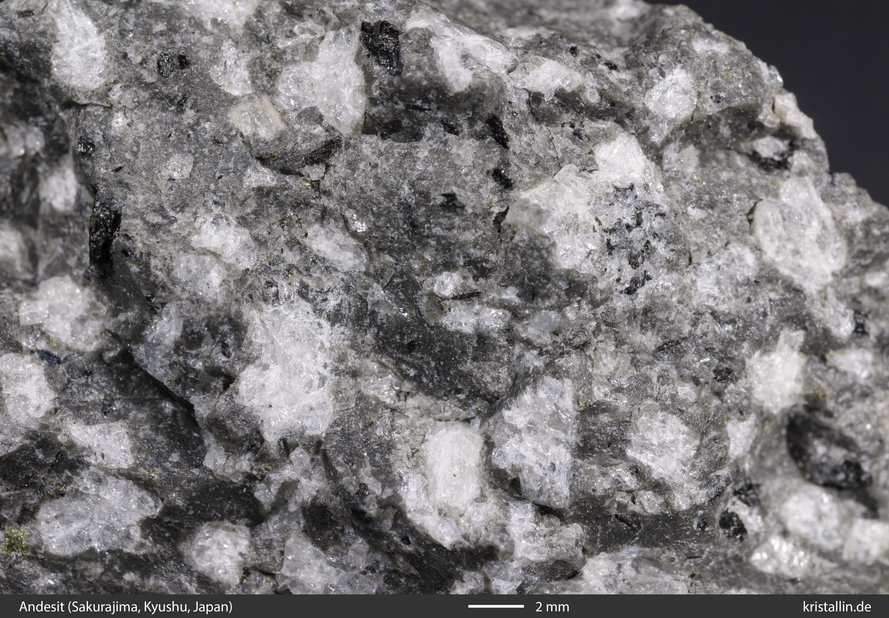 Die hellen Einsprenglinge hier sind Plagioklase, die dunklen Kristalle sehr wahrscheinlich Amphibole. (Für eine genaue Aussage müsste das Stück zerschnitten werden.)
