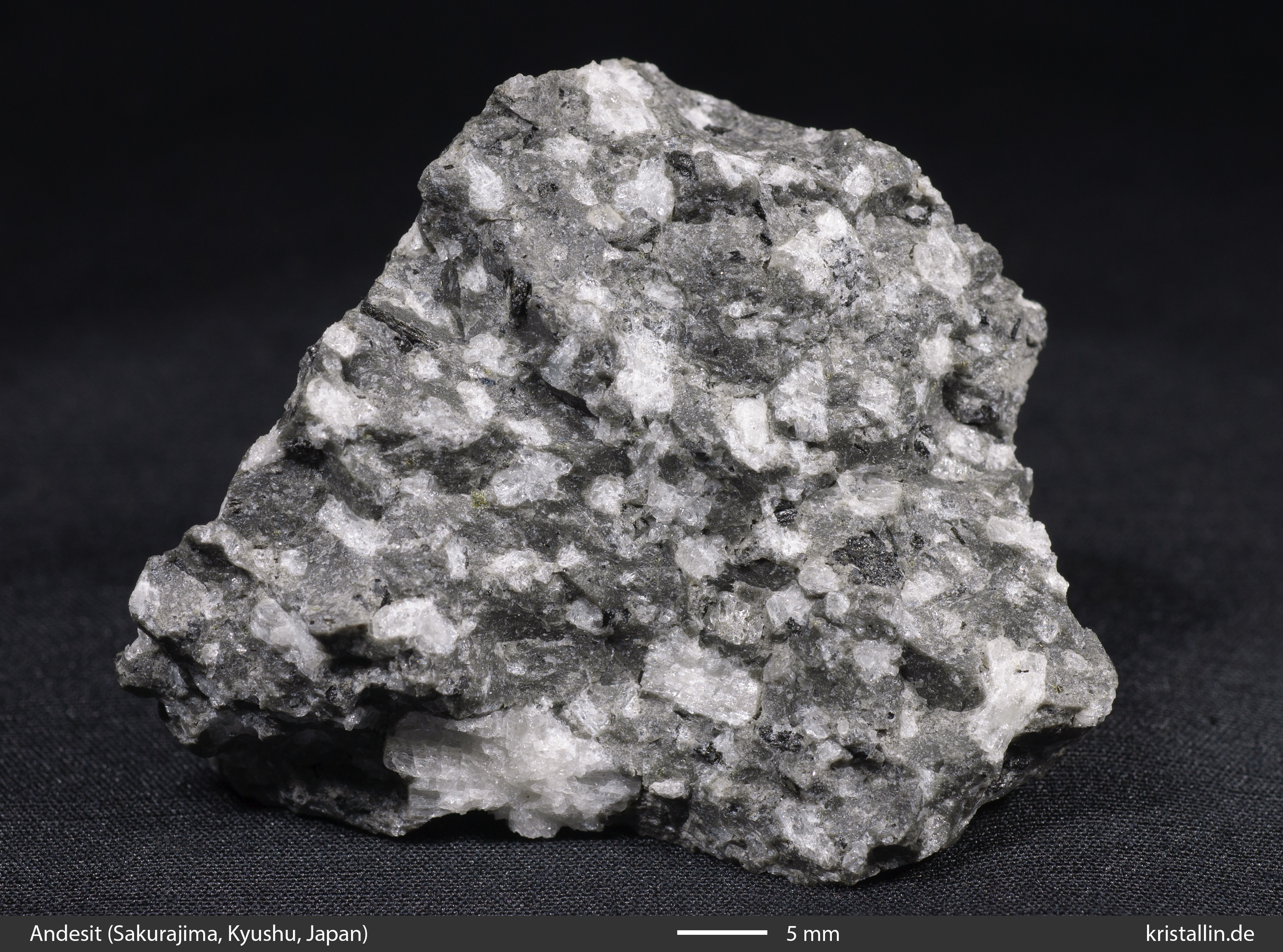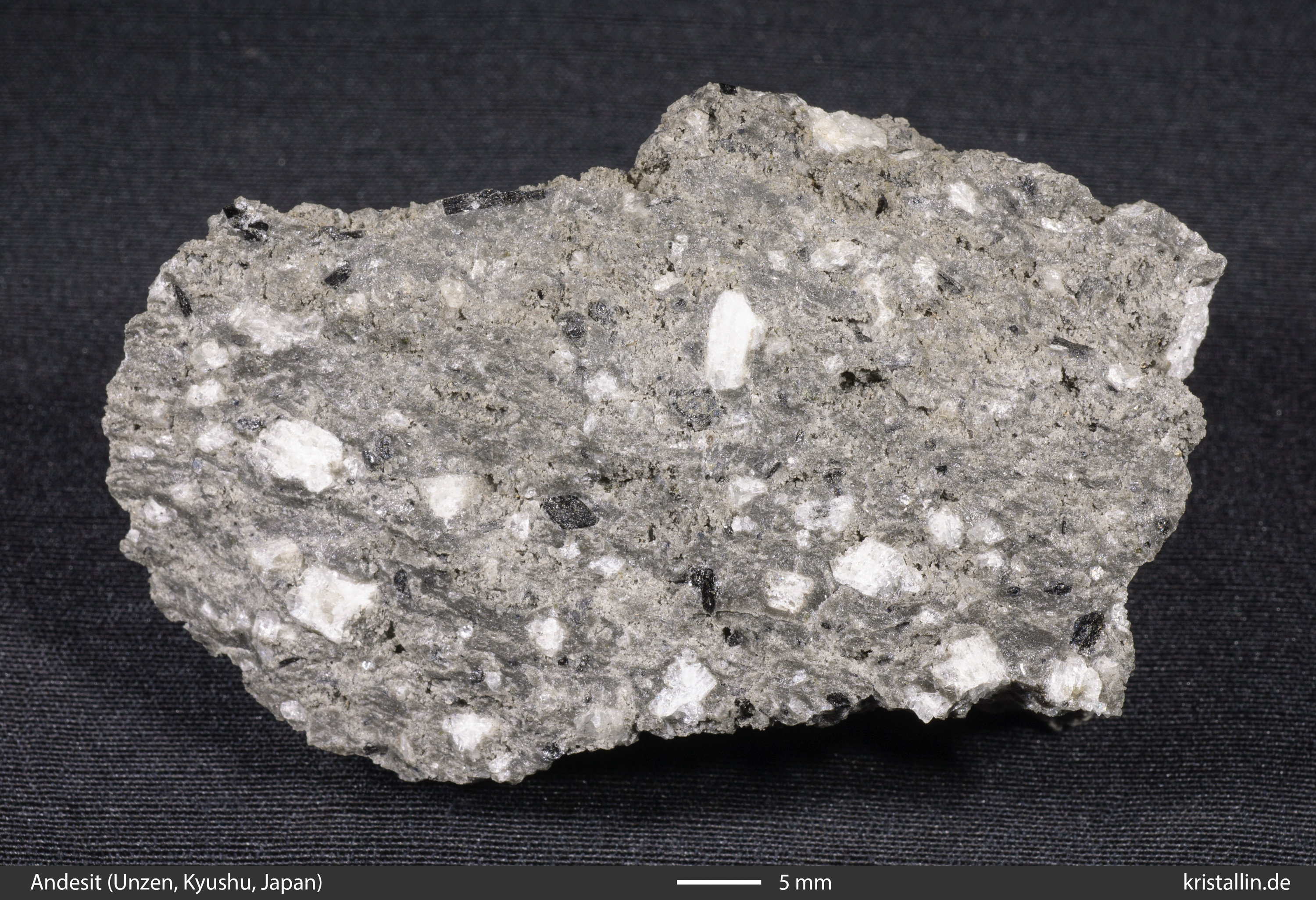 Auch das ist wieder ein typischer Andesit mit hellen Plagioklasen und mäßig vielen dunklen Mineralen.