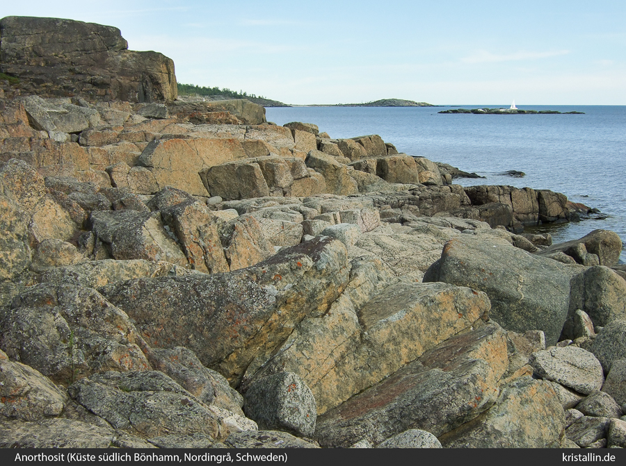 (12/47) Die „Hohe Küste“ ist auch ohne Geologie eine wunderschöne Landschaft. Wer Anorthosit im Wechsel mit Gabbro sehen möchte, wird an der Küste südlich von Bönhamn fündig.