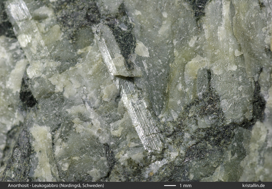 (15/47) The feldspars are photographed here looking at the narrow side of the crystals. Only these surfaces show the twins needed to recognize plagioclase.