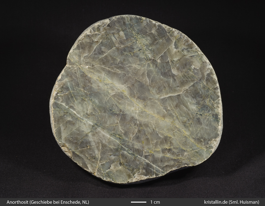(44/47) This erratic was found near Enschede in the Netherlands. The polished cut shows: The rock consists 100 % of a grey mineral, but because it has been cut and polished, it can no longer be determined.