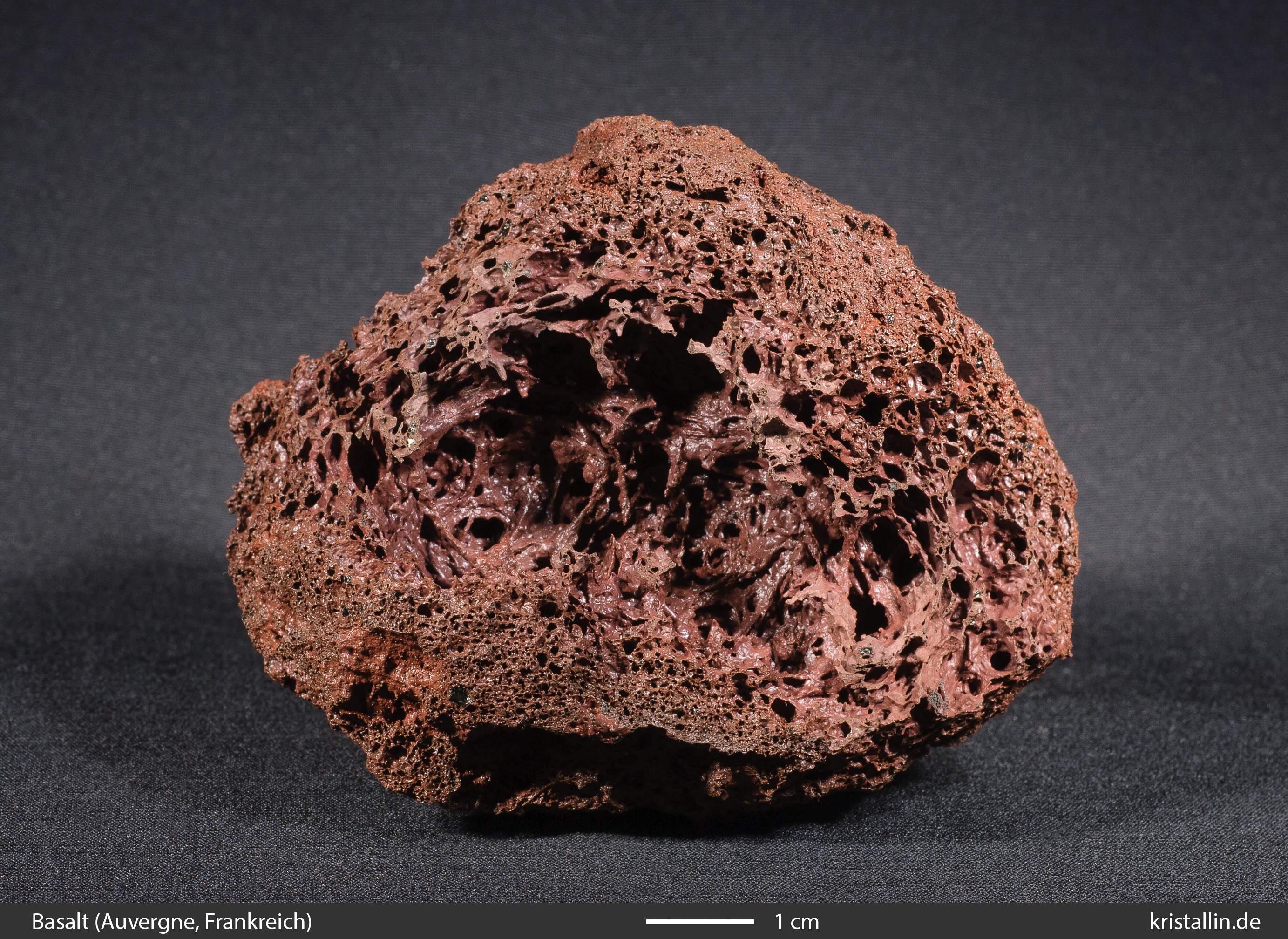 Die rötliche Farbe dieses Basalts ist auf chemische Reaktionen im noch heißen Gestein zurückzuführen.