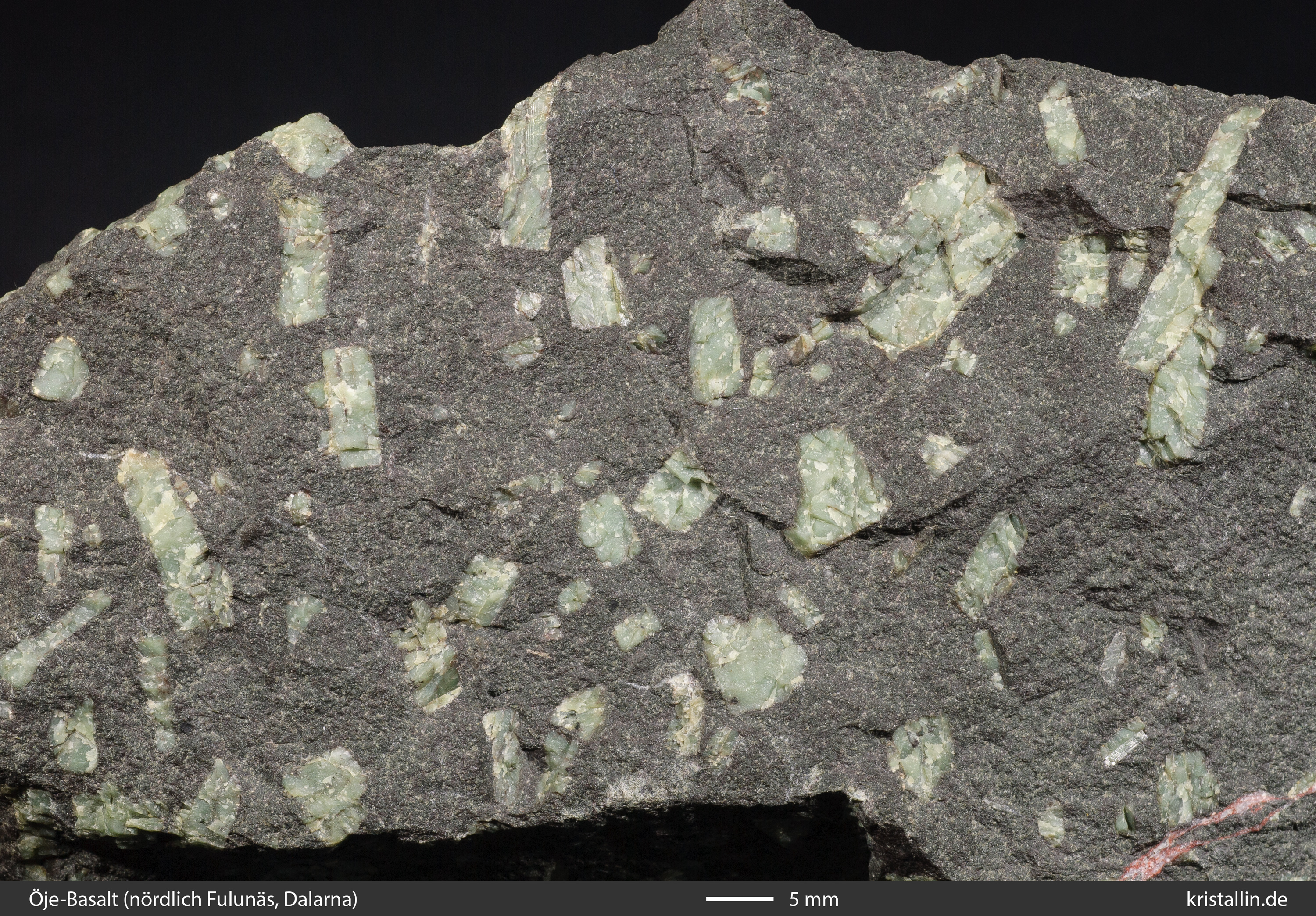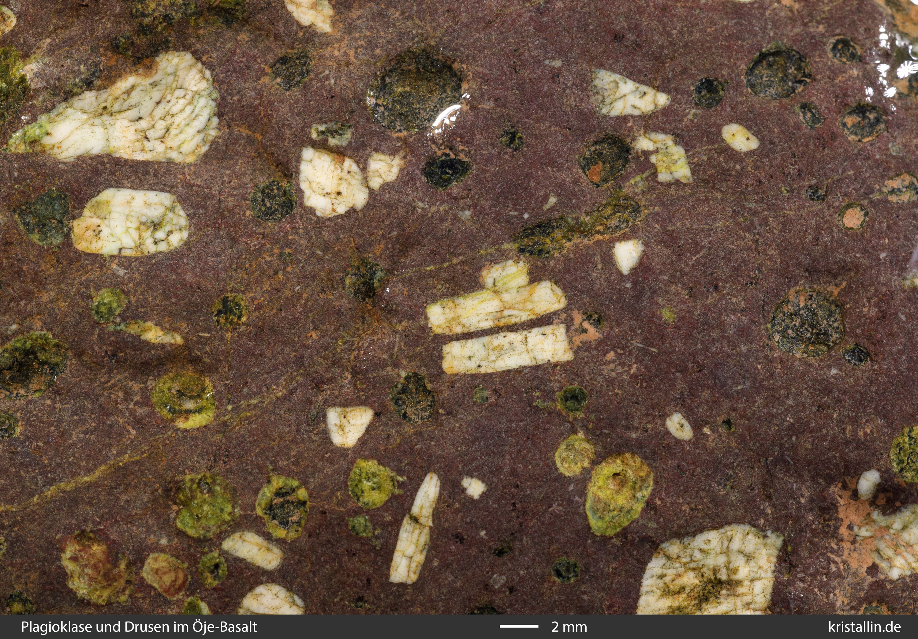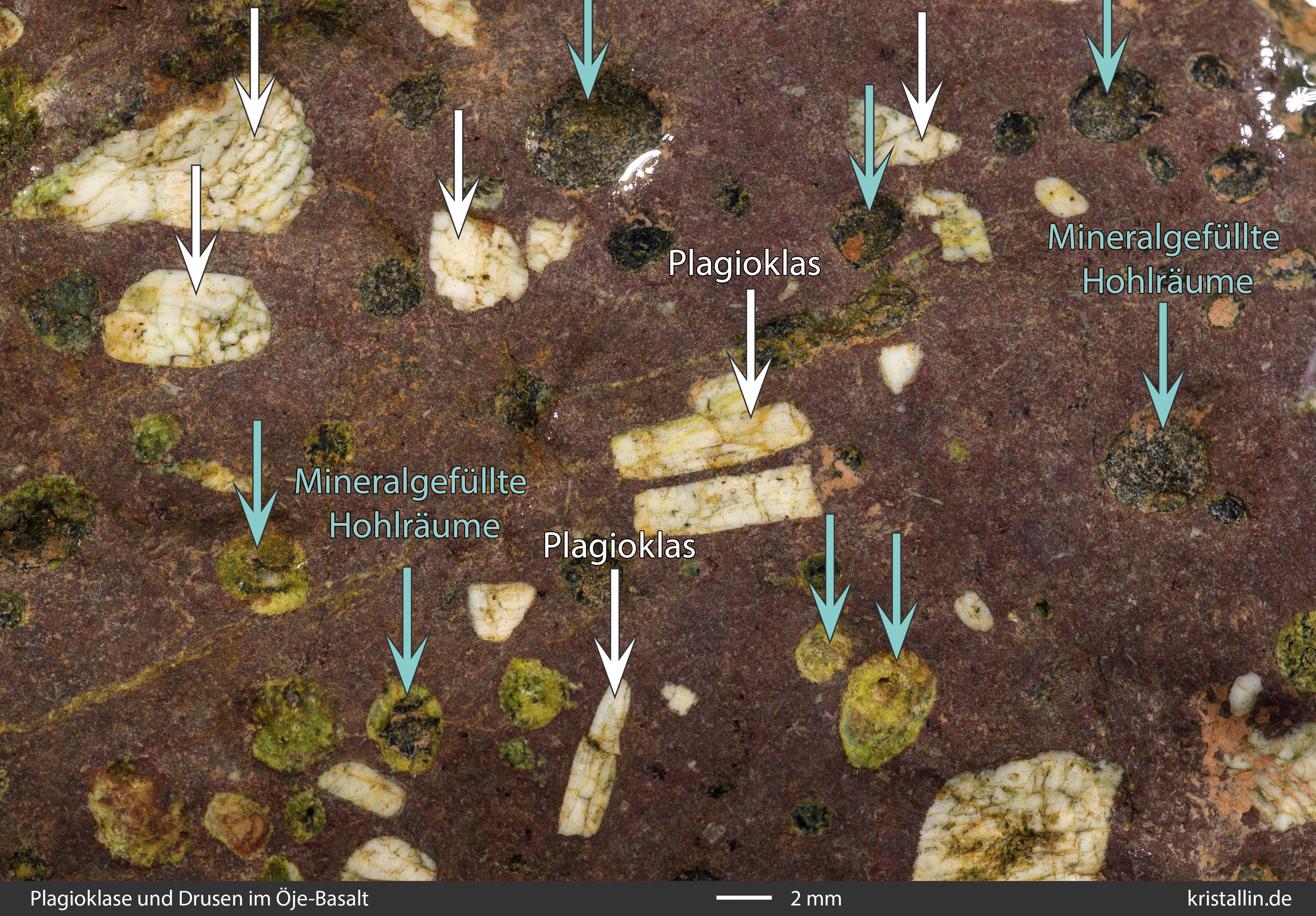Weil all das auf chemischen Analysen aufbaut, ist ihre Unterscheidung für Amateure nicht möglich. Man kann aber mit Hilfe der Plagioklas-Einsprenglinge bzw. der Peridotit-Einschlüsse zumindest auf zwei Typen von Basalt schließen: