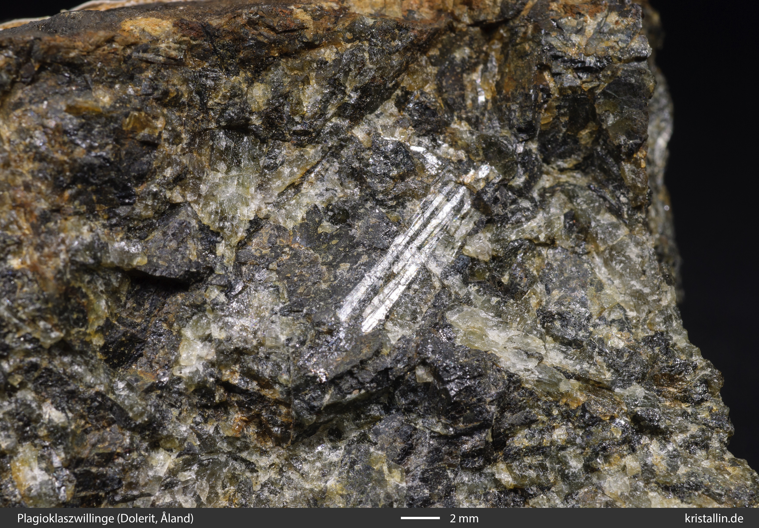 Zur Bestimmung von Plagioklas sucht man mit einer starken Lupe in den spiegelnden Spaltflächen die typischen Zwillinge, die sich dort als viele kleine, streng parallele Linien zeigen.