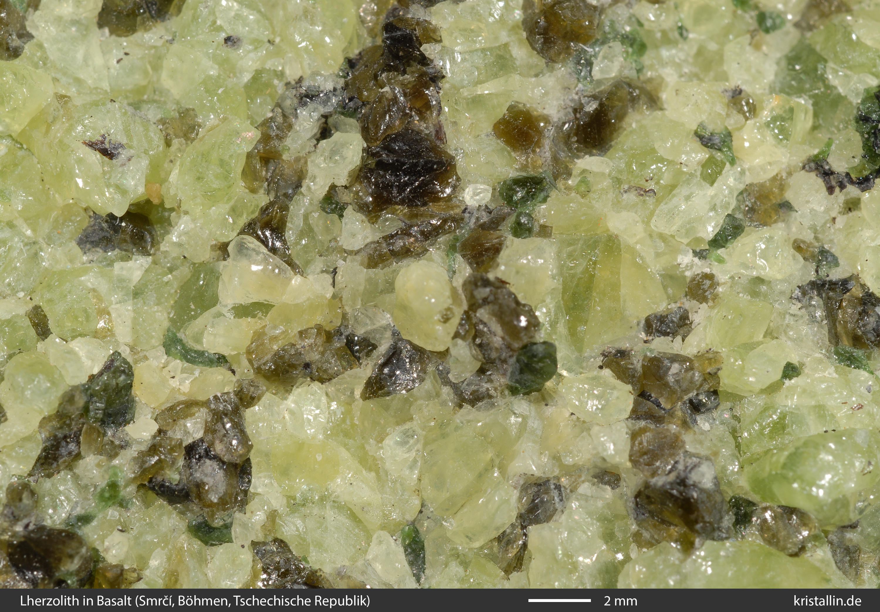 Die verschiedenen Minerale sind manchmal schon mit bloßem Auge erkennbar, wobei Olivin immer den größten Anteil hat. Er ist blassgrün bis leicht gelblich und viel weniger grün, als Laien erwarten. Dazu kommt Chromdiopsid, ein Klinopyroxen, den man an seiner grasgrünen Farbe leicht erkennt. Ein zweiter, regelmäßig vorkommender Pyroxen, ist Enstatit, ein Orthopyroxen. Er ist blass bräunlich oder olivfarben (Vinx 2015).
