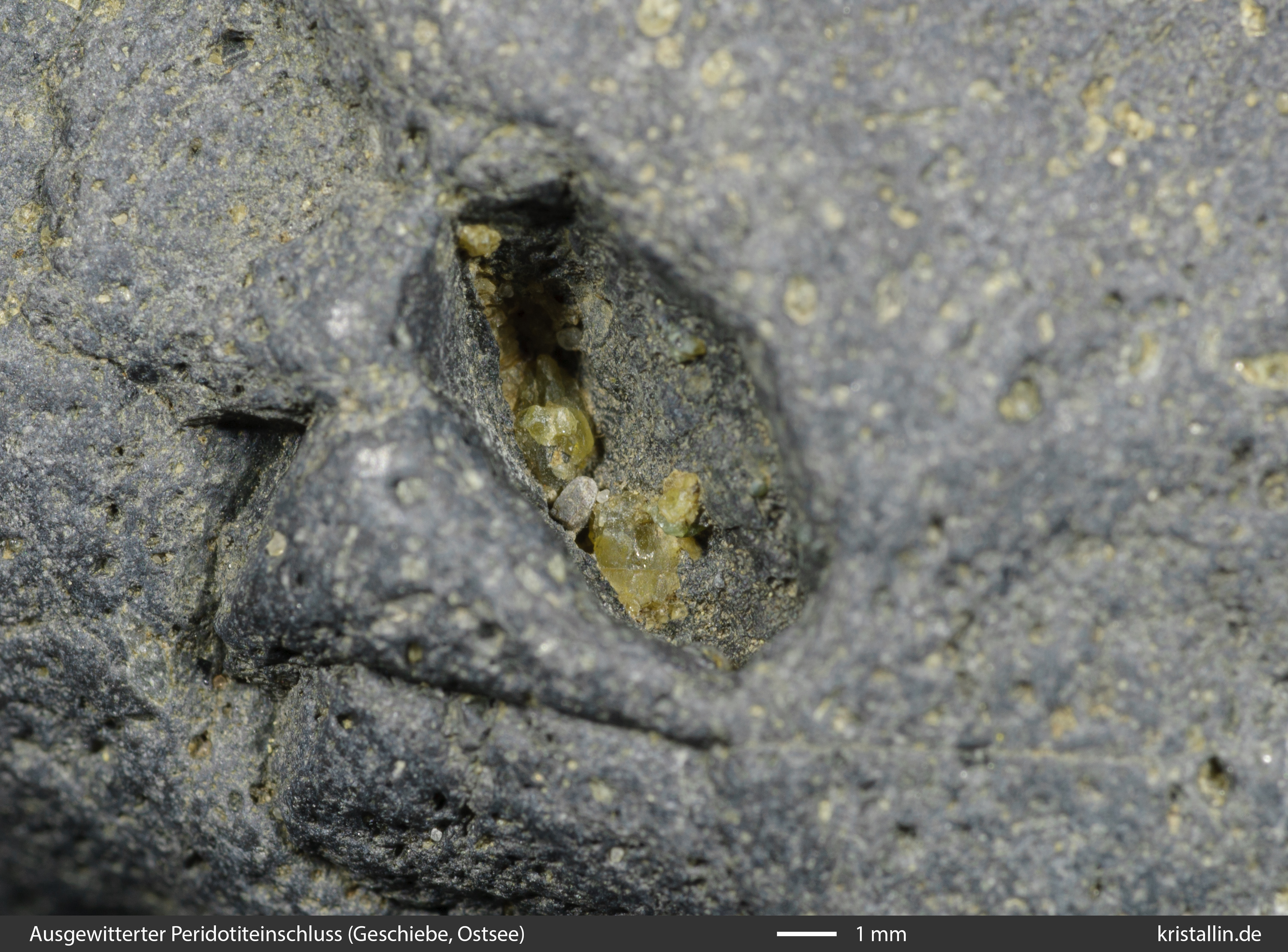 Peridotiteinschlüsse verwittern leicht, färben sich im Laufe der Jahre gelblich bis braun und zerfallen dann. Zurück bleiben Löcher im Gestein. Wenn Sie am Boden so einer Vertiefung noch ein paar gelblichgrüne Körnchen finden, dann sind das die Reste eines Peridotits und damit ist das Gestein ein Basanit aus Südschweden. (Das gilt nur für Glazialgeschiebe in Norddeutschland.)
