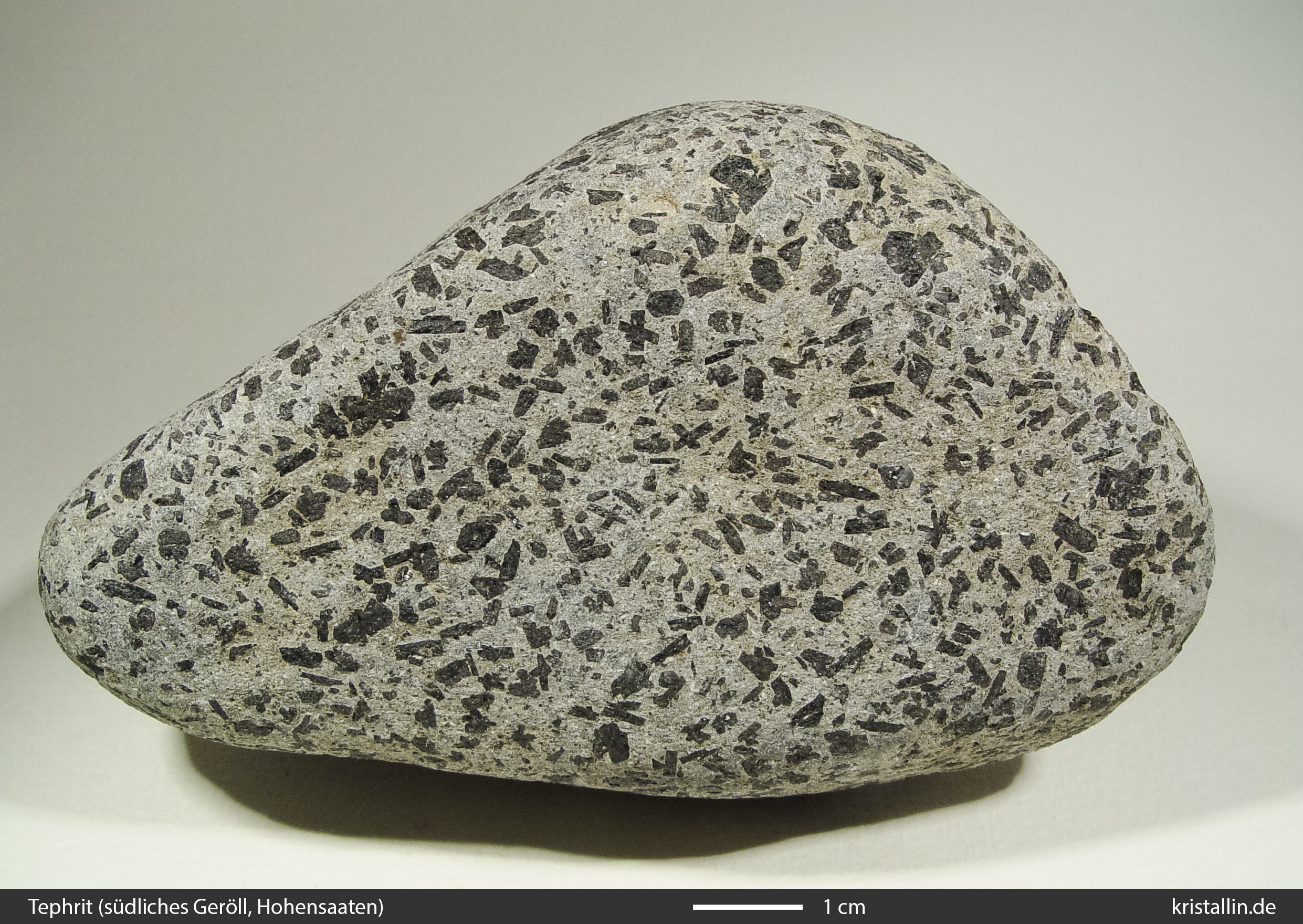 Ein Tephrit ist ein basaltisches Gestein mit weniger als 10 % Olivin. Dazu kommen wieder Klinopyroxen, Plagioklas und 10-60 % Feldspatvertreter (meist Nephelin). Von den schwarzen Klinopyroxenen abgesehen, stecken alle Minerale in der feinkörnigen Grundmasse.