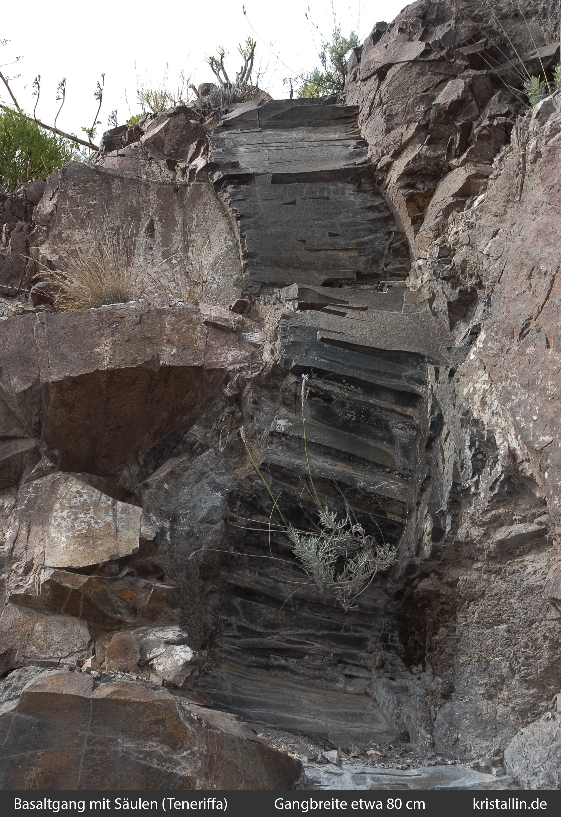 Der senkrecht stehende Basaltgang im folgenden Bild ist knapp einen Meter breit. In ihm liegen die Säulen quer, weil sich die Schmelze von den Rändern her abkühlte.