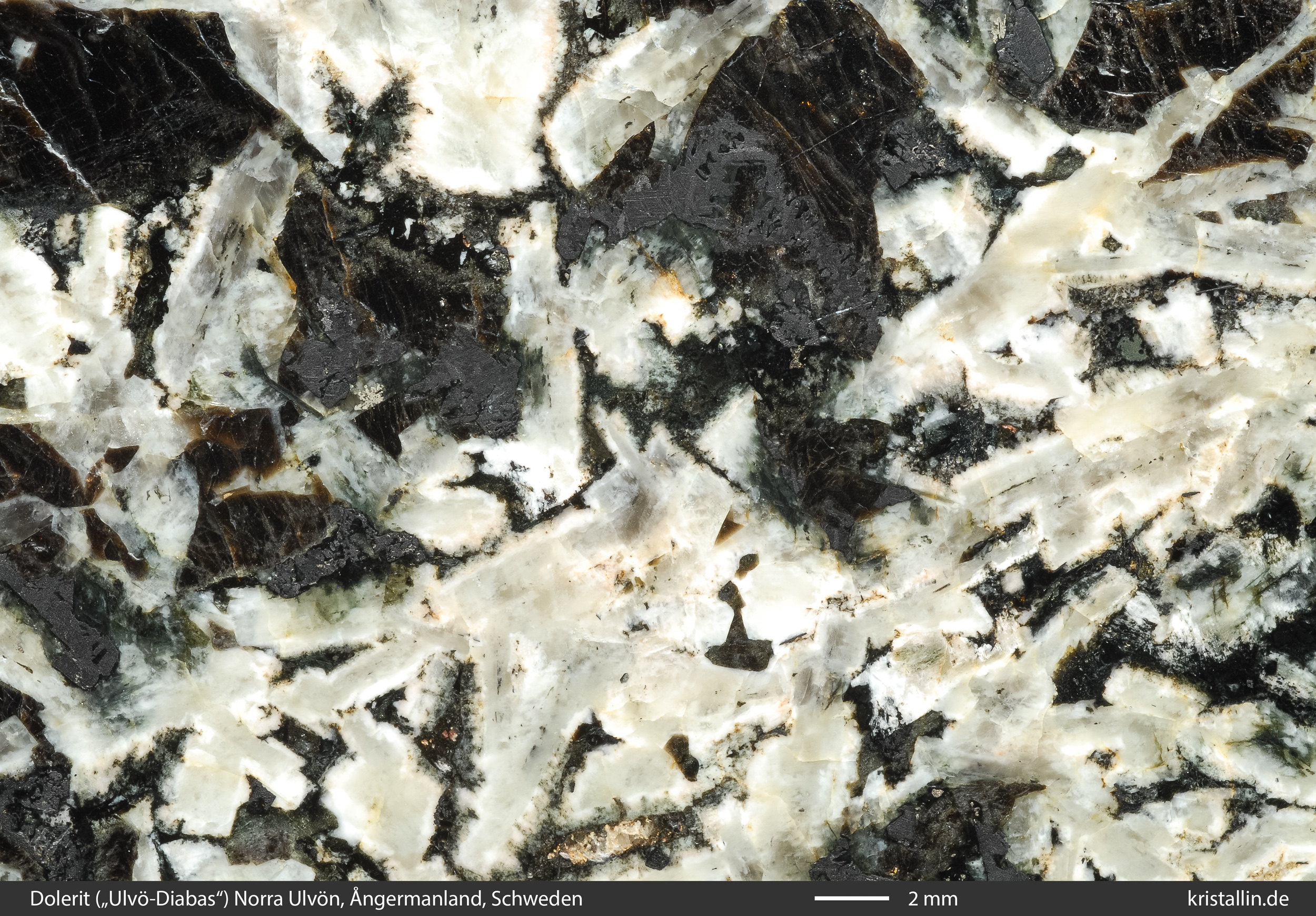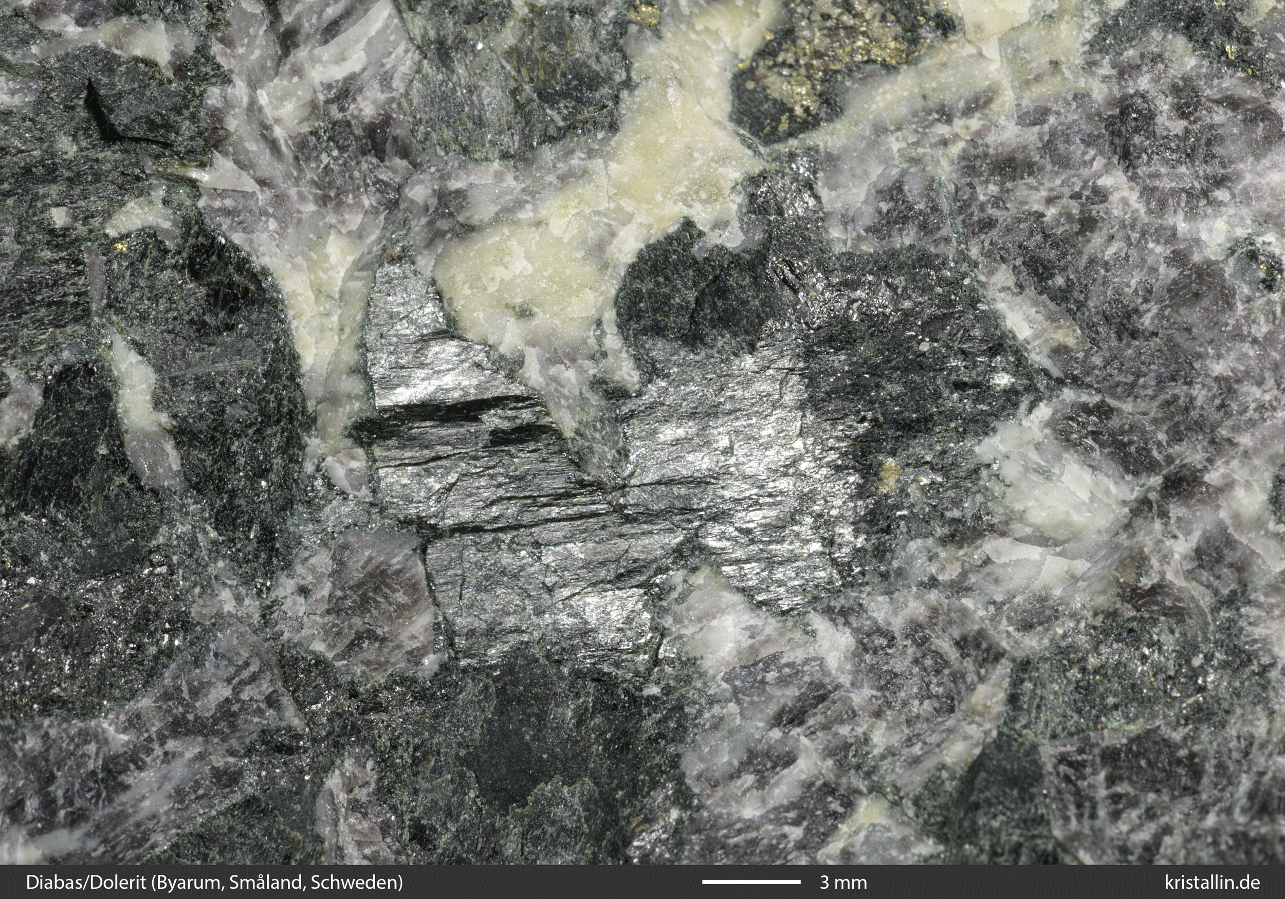 Weil man die pyroxentypischen Spaltwinkel von 90° fast nie findet, ist es besser, auf den eher matten Glanz der Pyroxene zu achten und die leistenförmigen, hellen Feldspäte als Plagioklase zu bestimmen. Enthält das Gestein dann noch Magnetit, kann man sicher sein, einen Dolerit/Diabas vor sich zu haben.