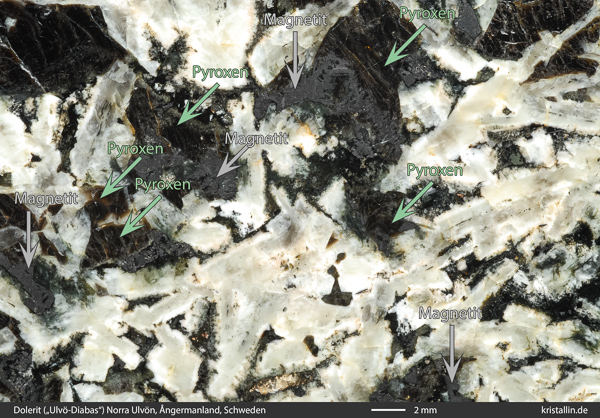 Solche grobkörnigen Diabase/Dolerite sind für Einsteiger ideal geeignet, die Bestimmung von Plagioklas, Pyroxen und Magnetit zu üben. Es gibt keine Gesteine, in denen man diese Minerale besser erkennt.