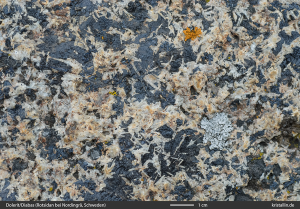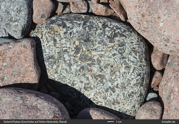 Wer in Schweden unterwegs ist, findet ein bemerkenswert großes Vorkommen bei Nordingrå. Die Küste dort heißt „Rotsidan“ und besteht auf mehreren Kilometern Länge aus einem grobkörnigen Diabas/Dolerit. Bild 11 (oben) ist eine Nahaufnahme.