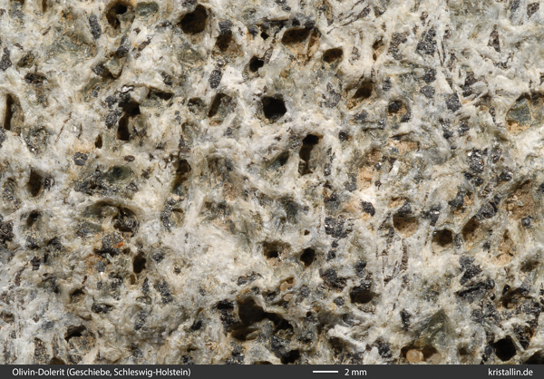 Gibt es auf der Oberfläche eines Steins Löcher, dann sind dort Minerale ausgewittert. Wurde das Gestein vorher als Dolerit bestimmt, dann liegt Olivin nahe. Aber das ist dann nur ein Hinweis und keine Bestimmung. Dafür braucht es eine Bruchfläche.