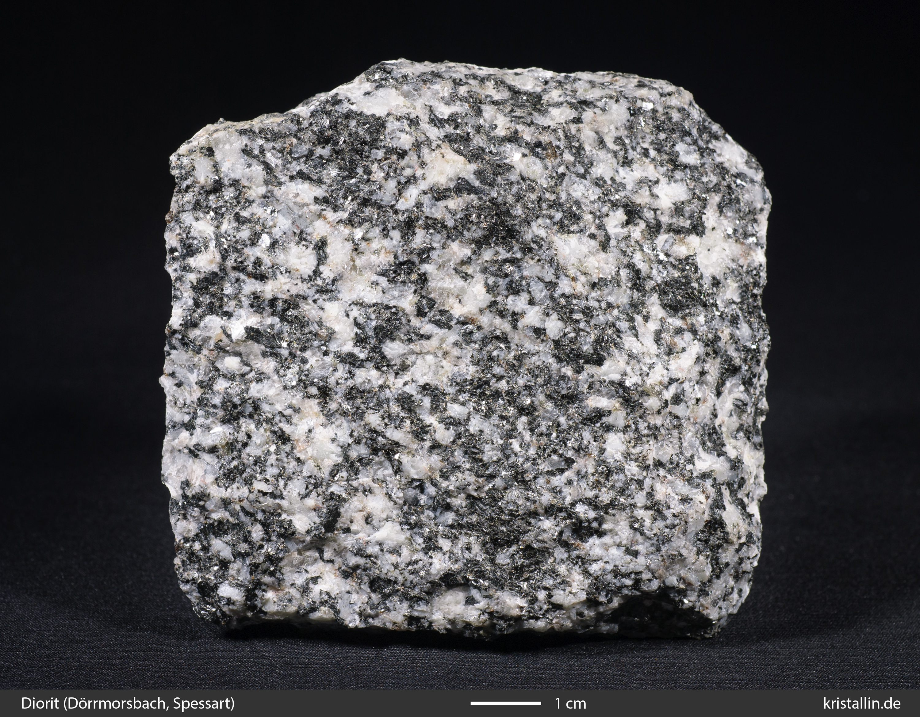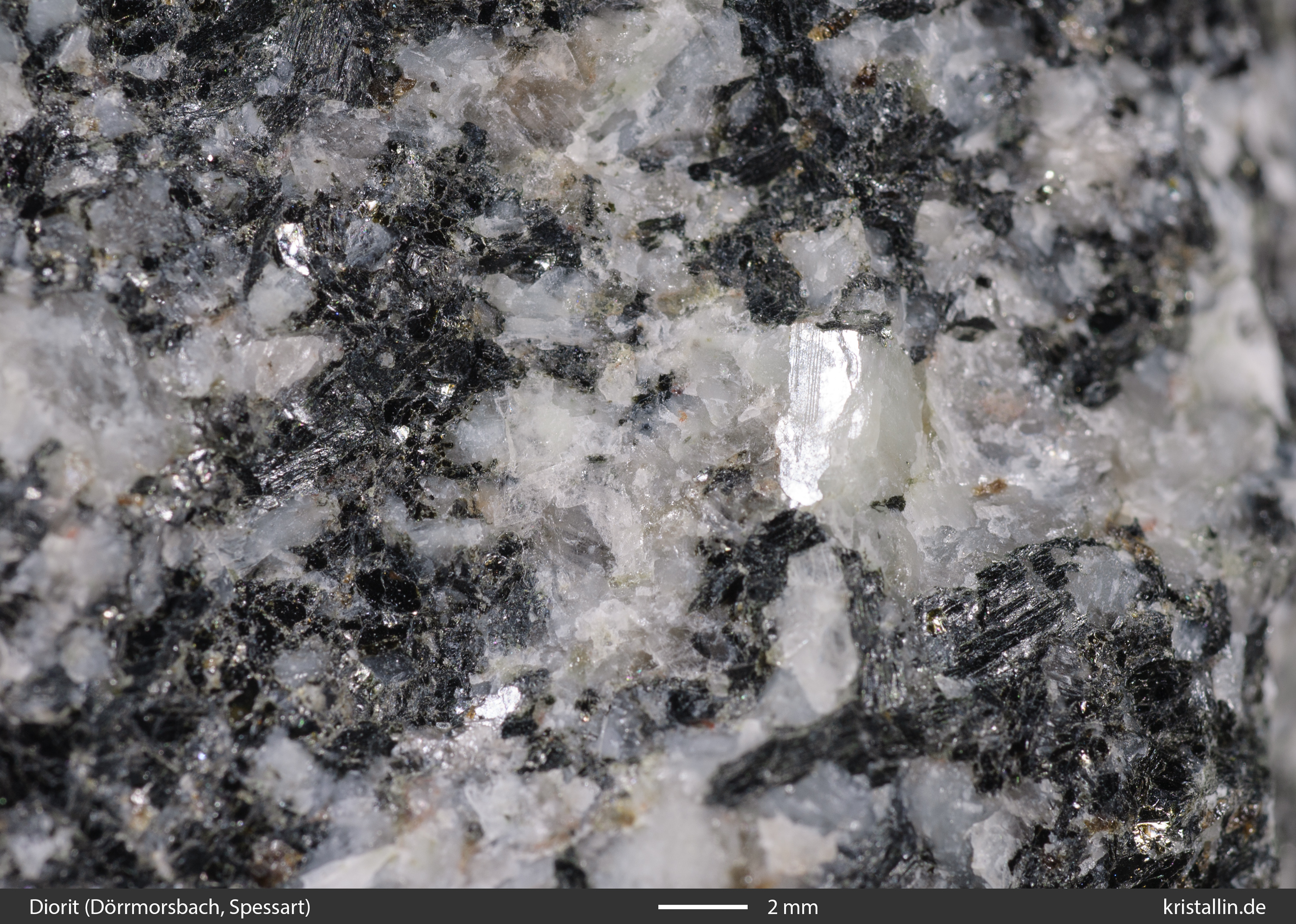 Diorit ist ein grobkörniges, magmatisches Tiefengestein mit Plagioklas als einzigem Feldspat. Typische Diorite sehen schwarz-weiß aus und enthalten neben Plagioklas noch Biotit oder Hornblende oder beide. Titanit kann in kleiner Menge vorkommen, Quarz fehlt in der Regel.