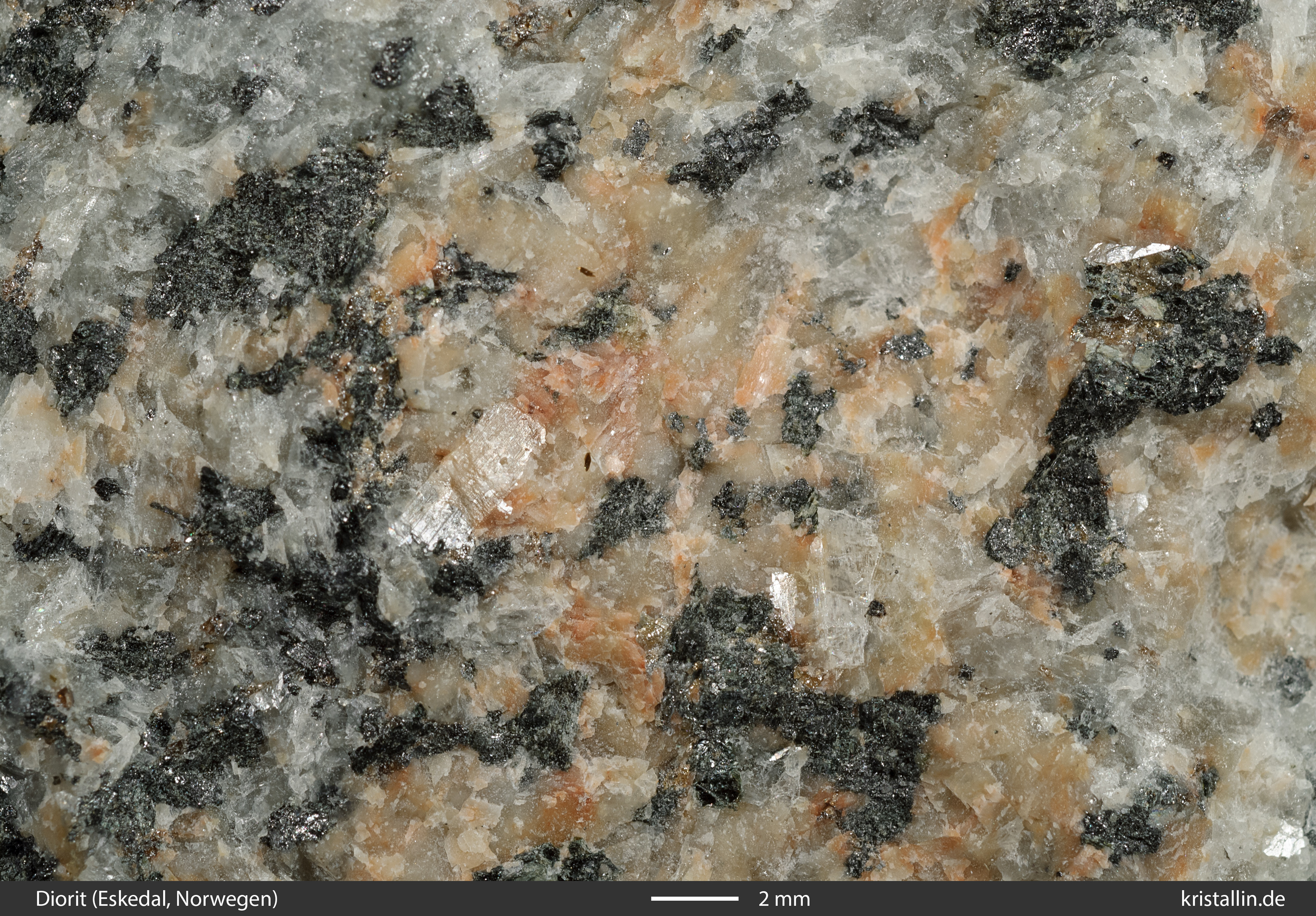 Leicht farbige Diorite sind eine Ausnahme. Das zeigt das folgende Handstück aus Südnorwegen, bei dem die vielen Plagioklase schon im Gelände den Verdacht weckten, dass dies ein Diorit sein könnte. Aber erst ein Dünnschliff brachte die Bestätigung.