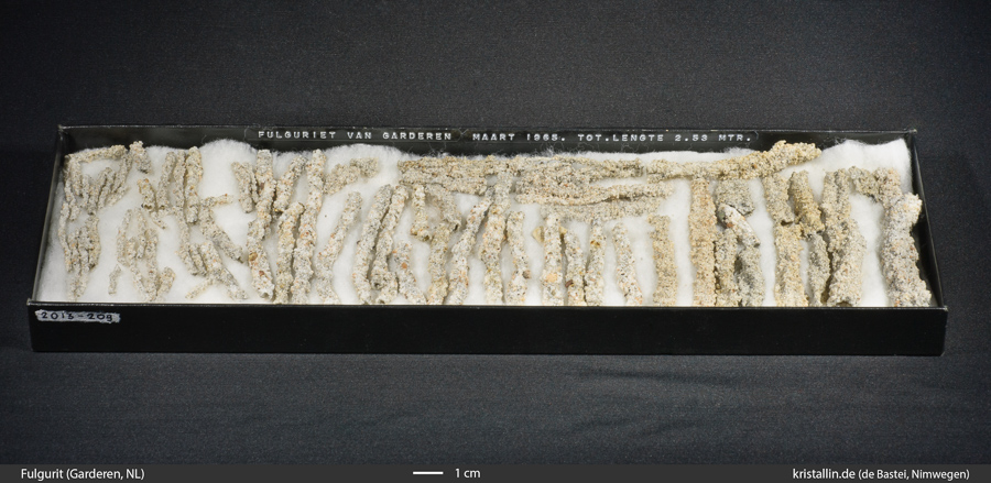 (6/14) Die Bruchstücke liegen auf Watte in einer Schachtel und sind zusammen über 2,5 Meter lang. Dieser Fulgurit wurde 1965 ausgegraben.