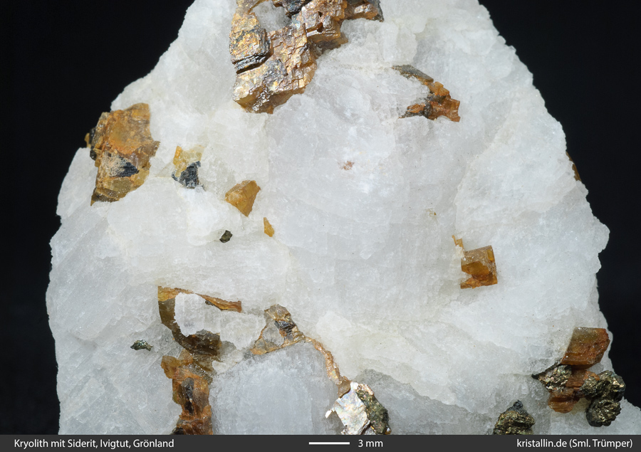 (2/6) Der weiße Kryolith zeigt undeutliche interne Strukturen. Die Probe besteht offensichtlich aus unterschiedlich orientierten Teilen, da die schwache Streifung in verschiedene Richtungen zeigt.