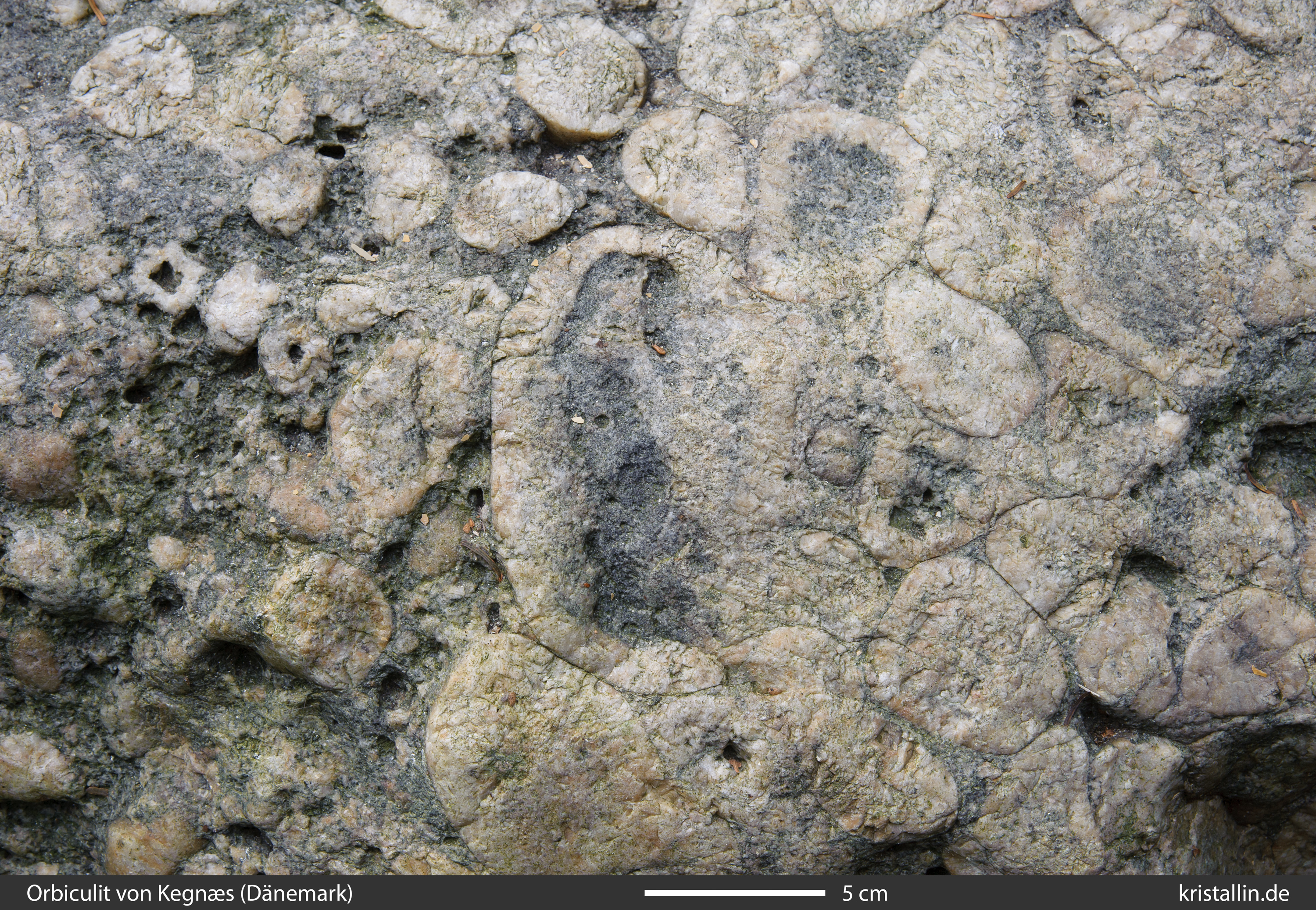 Die Zusammensetzung der Orbiculite ist überaus vielfältig, denn man hat sie in praktisch allen magmatischen Gesteinen gefunden. Dabei ist die Größe der Orbicule mit dem SiO2 -Gehalt verknüpft. Steigt sein Anteil, werden die Orbicule größer. In ultramafischen Peridotiten oder in einem Karbonatit sind die Orbicule nur klein.