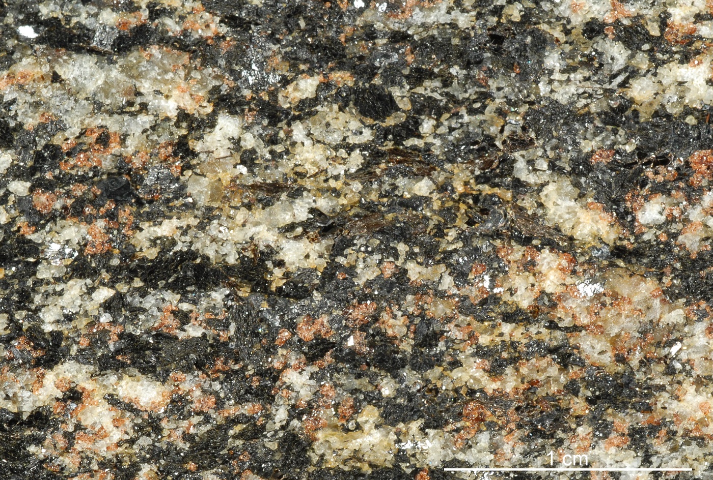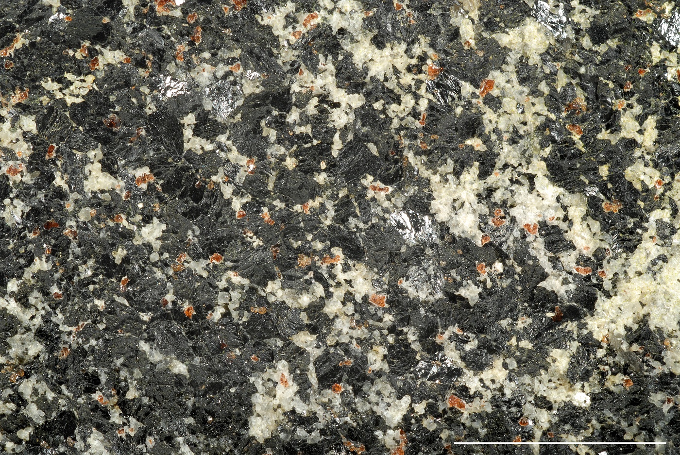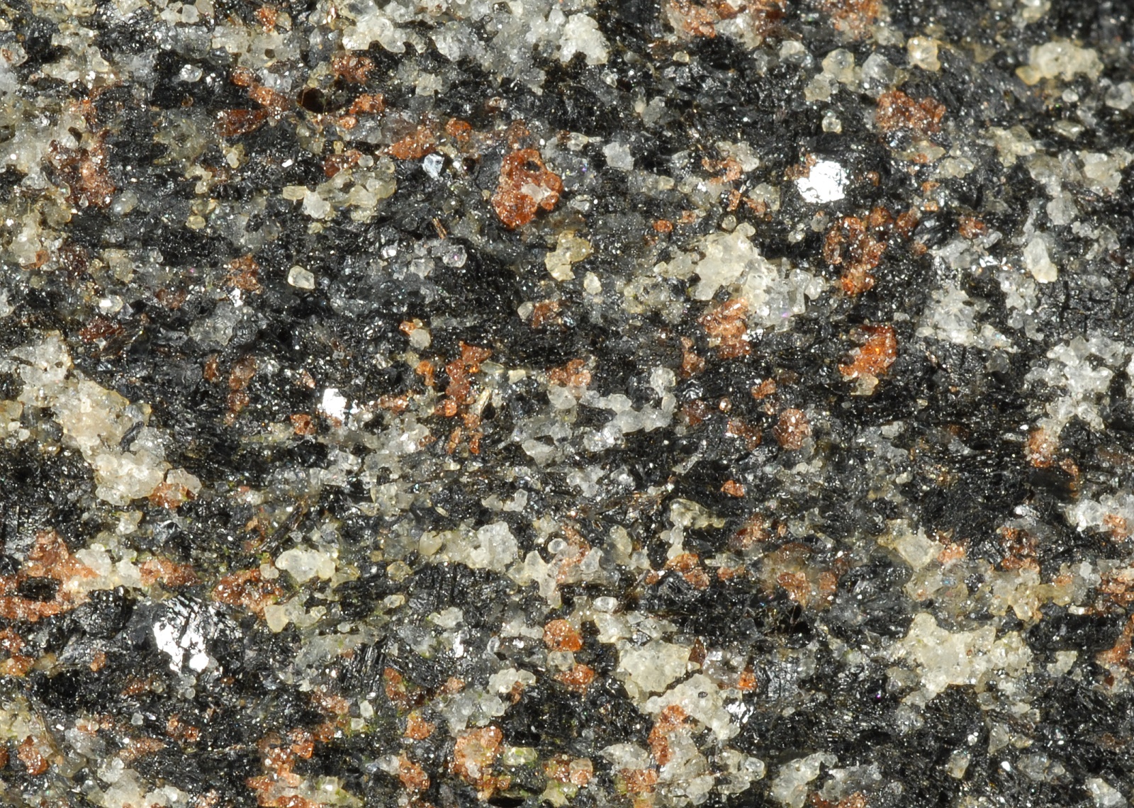 Schwarz: Amphibol (Hornblende), weiß: Plagioklas, rötlichbraun: Granat
