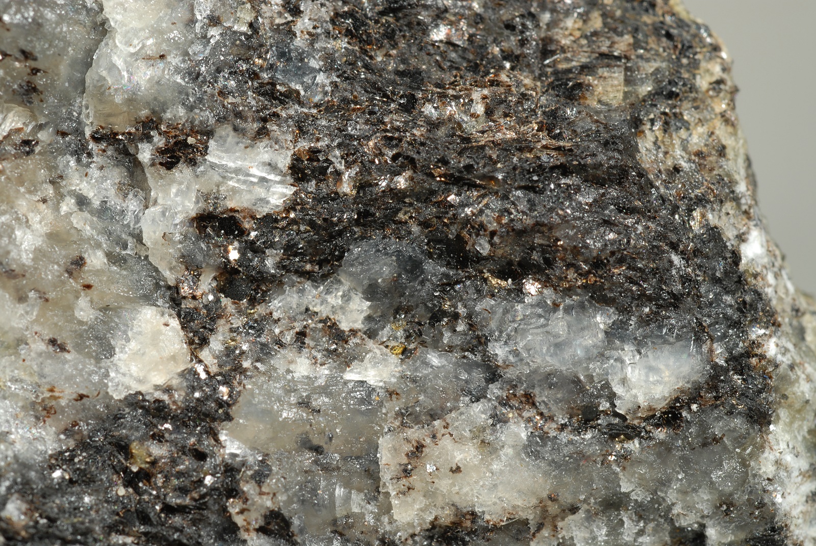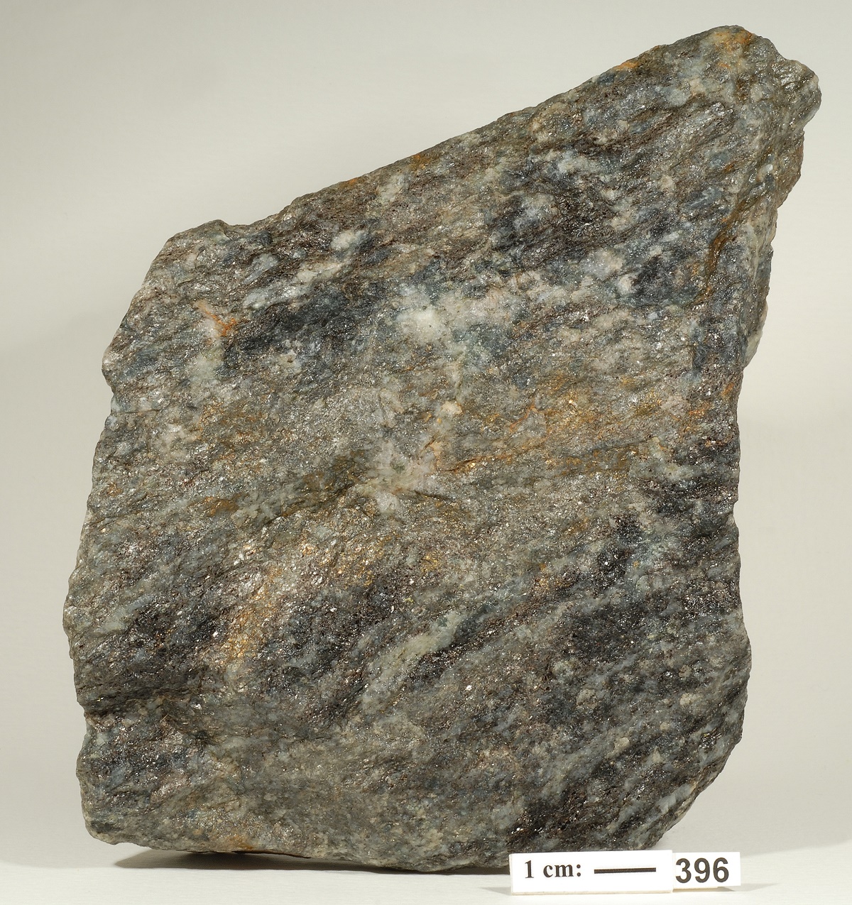Das blaugraue, unscharf begrenzte Mineral in diesem Gneis ist Cordierit.