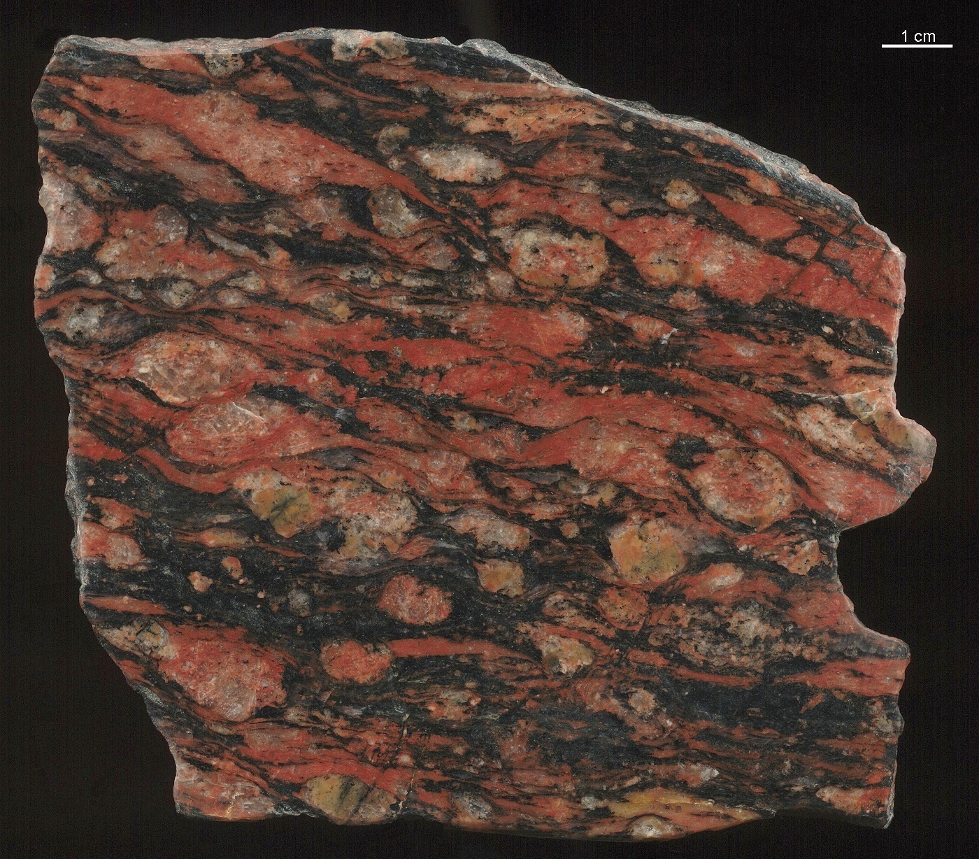 Das Gestein als Ganzes zeigt ein deformiertes und gestrecktes Gefüge: