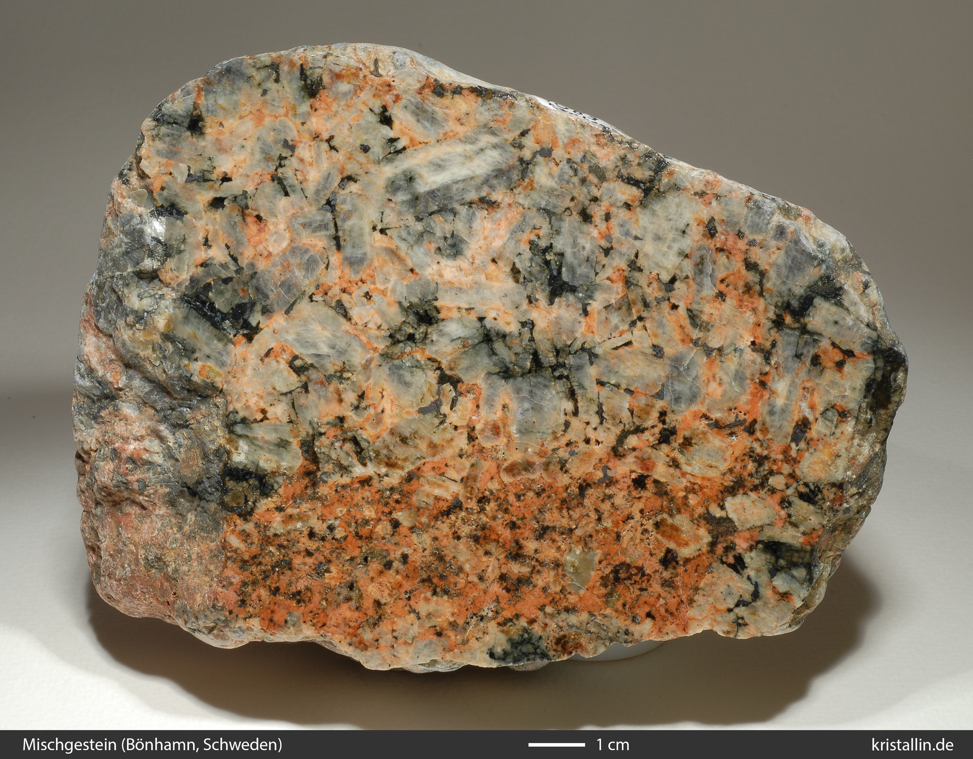 Das wirklich Bedeutsame an Höggrund ist, dass nun die Mischung von Granit und Anorthosit kein exotischer Einzelfall mehr ist. Man kann sogar davon ausgehen, dass solche Gesteine auch anderswo vorkommen, insbesondere in Rapakiwiplutonen. Den Beleg für diese Behauptung finden wir im Deutschen Natursteinarchiv in Wunsiedel, in dessen Sammlung sich das folgende Gesteinsmuster befindet: